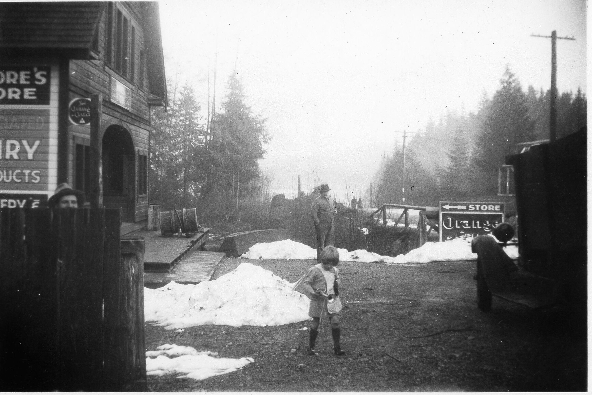 Image of child walking in street in front of Moore house that was operating as a store. Man in background and car to left. Snow in patches in the ground.Collection