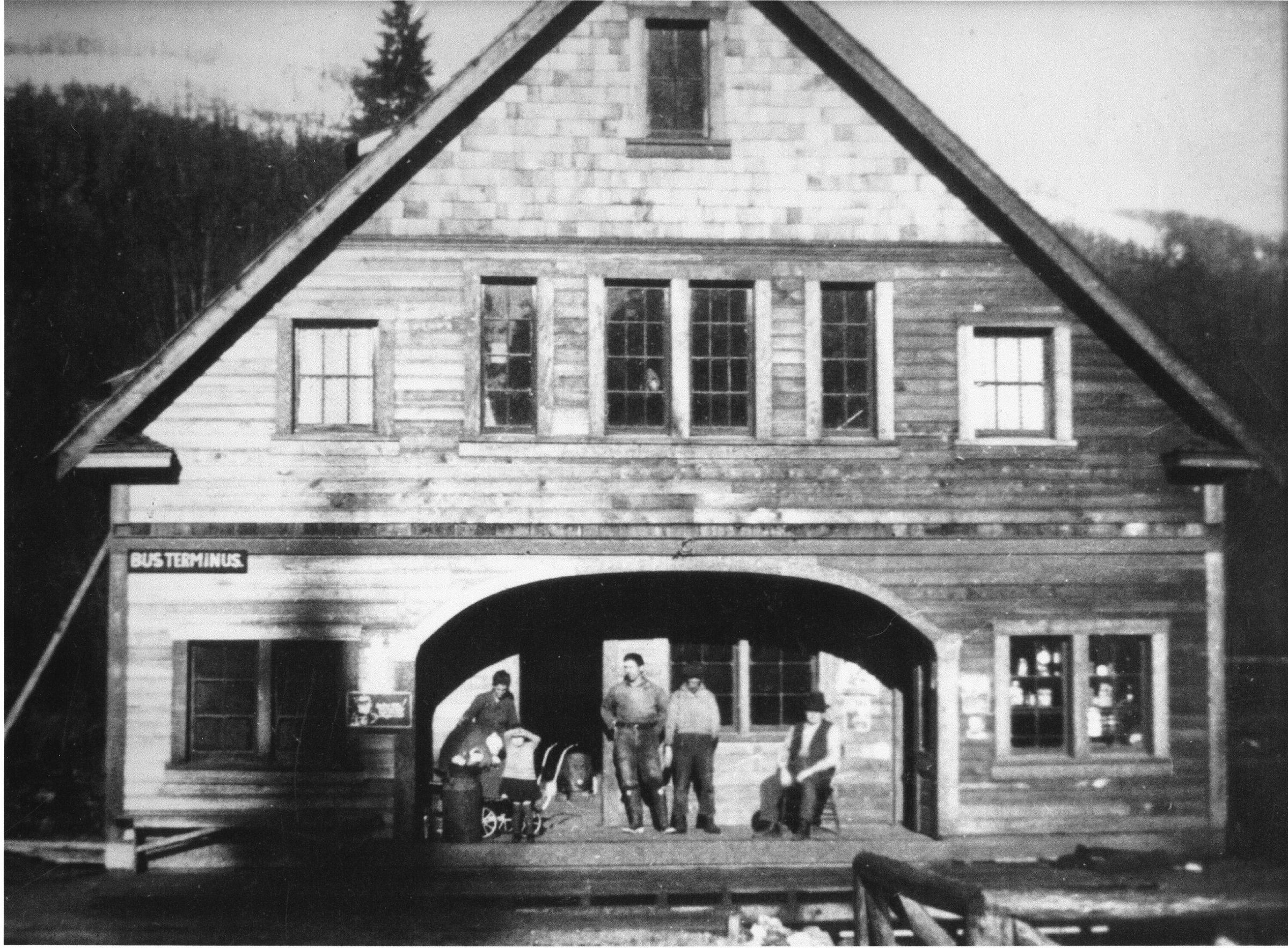Straight on shot of front of Deep Cove Lodge, formerly the Moore first homestead on Second and Burns. A group of people on porch, and look to be waiting for bus.Collection