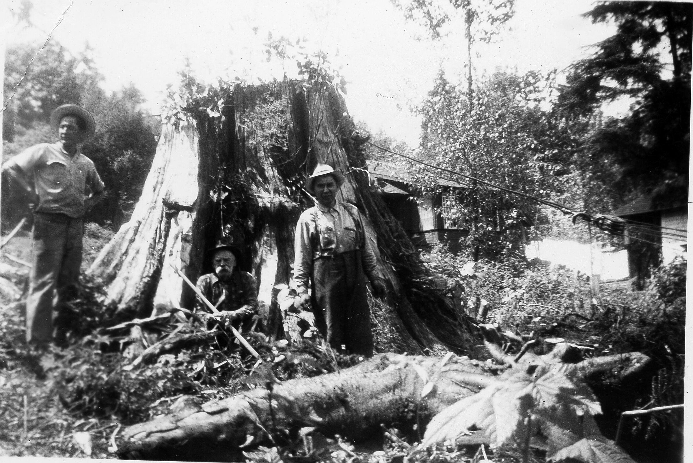 0082 - John Moore at centre . Two men on either side. Large stump behind. Other houses in background