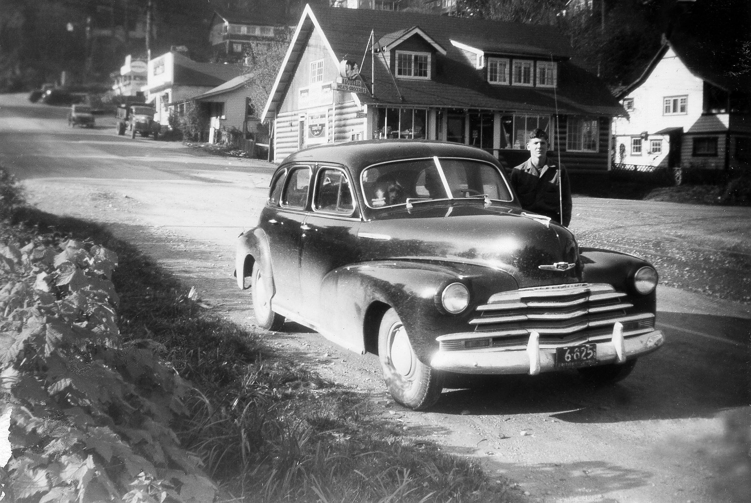 Young Man looking at camera, standing beside front passenger door of a black Chevy Chrysler car. Grocery Story behind himCollection