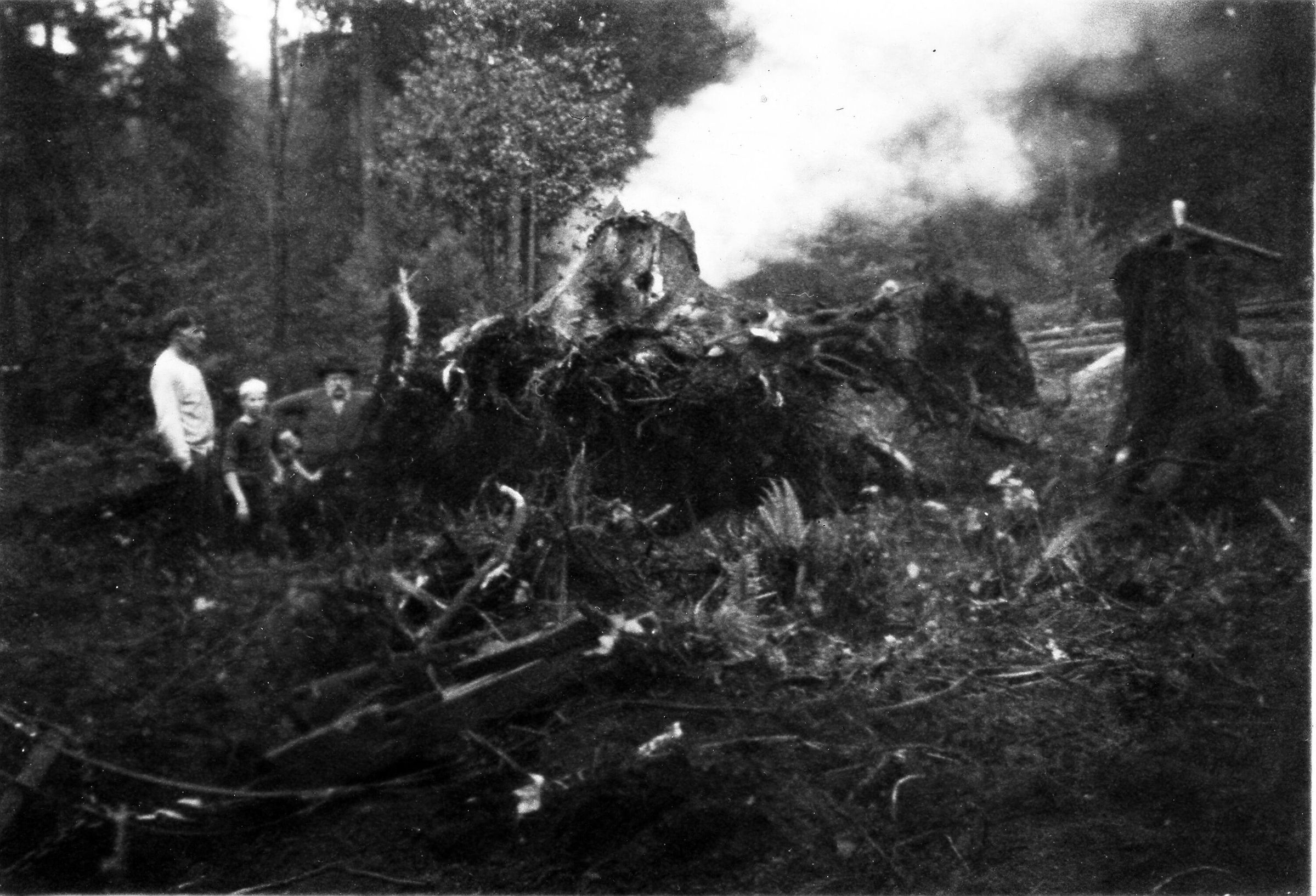 0090 - People clearing land John Moore and people beside burning brush in clearing