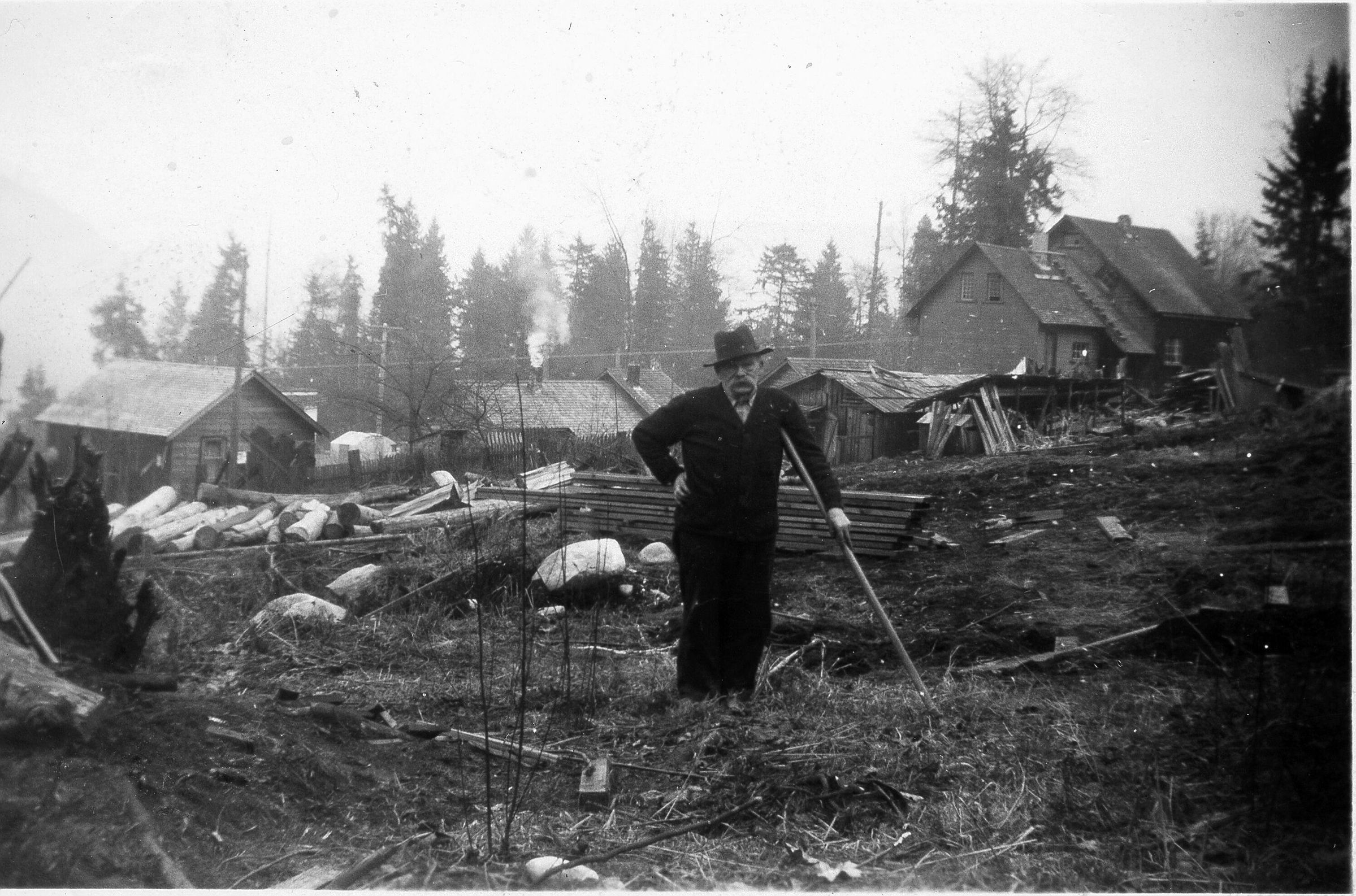 Mr Moore is standing in middle of picture and posing for photo. Cleared logs, brush and houses in backgroundCollection
