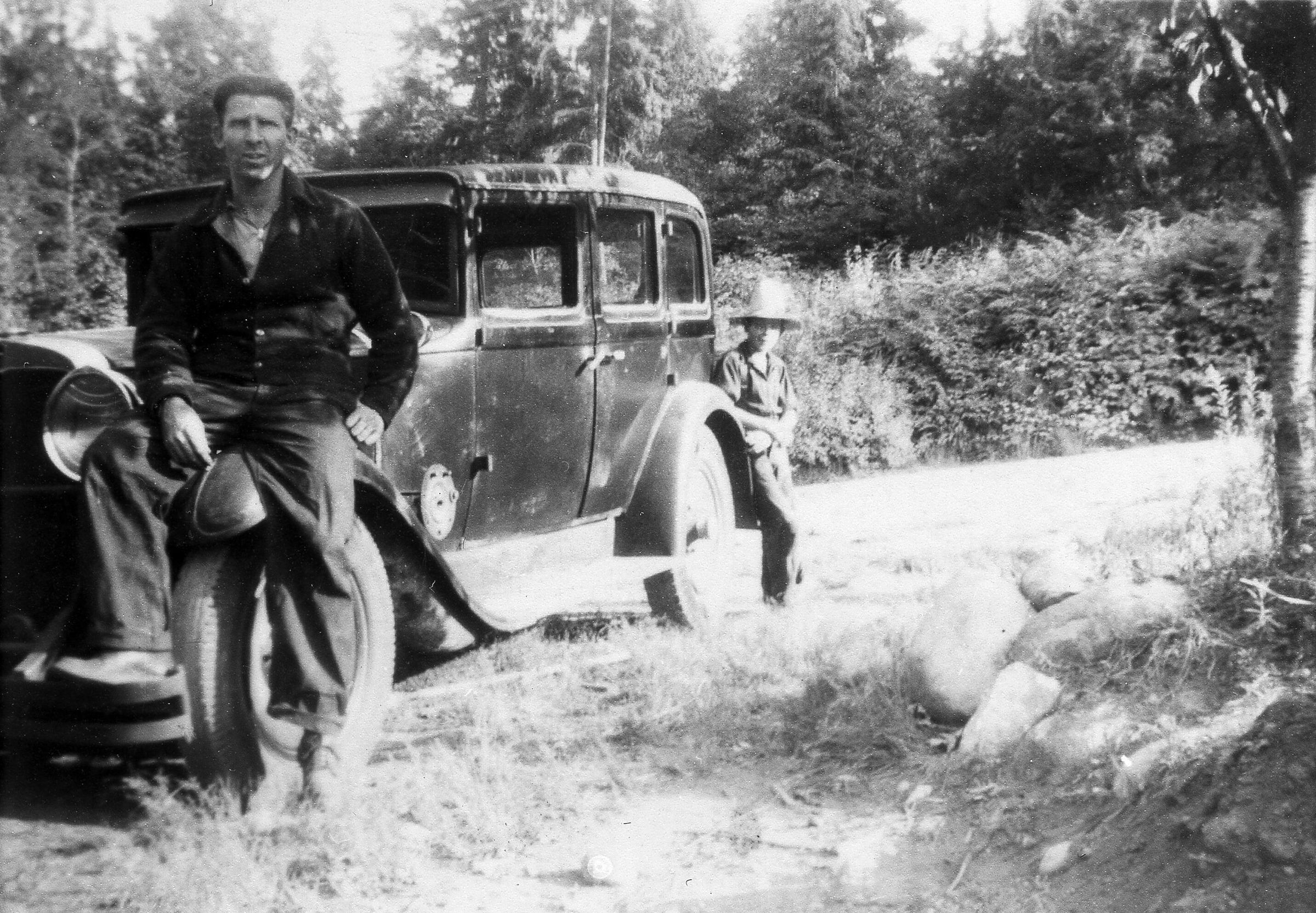 0096 - John Moore leaning on front of car with Tom Moore leaning on back of car in back ground. On dirt road and cleared field area surrounded by shurbs and treesCollection