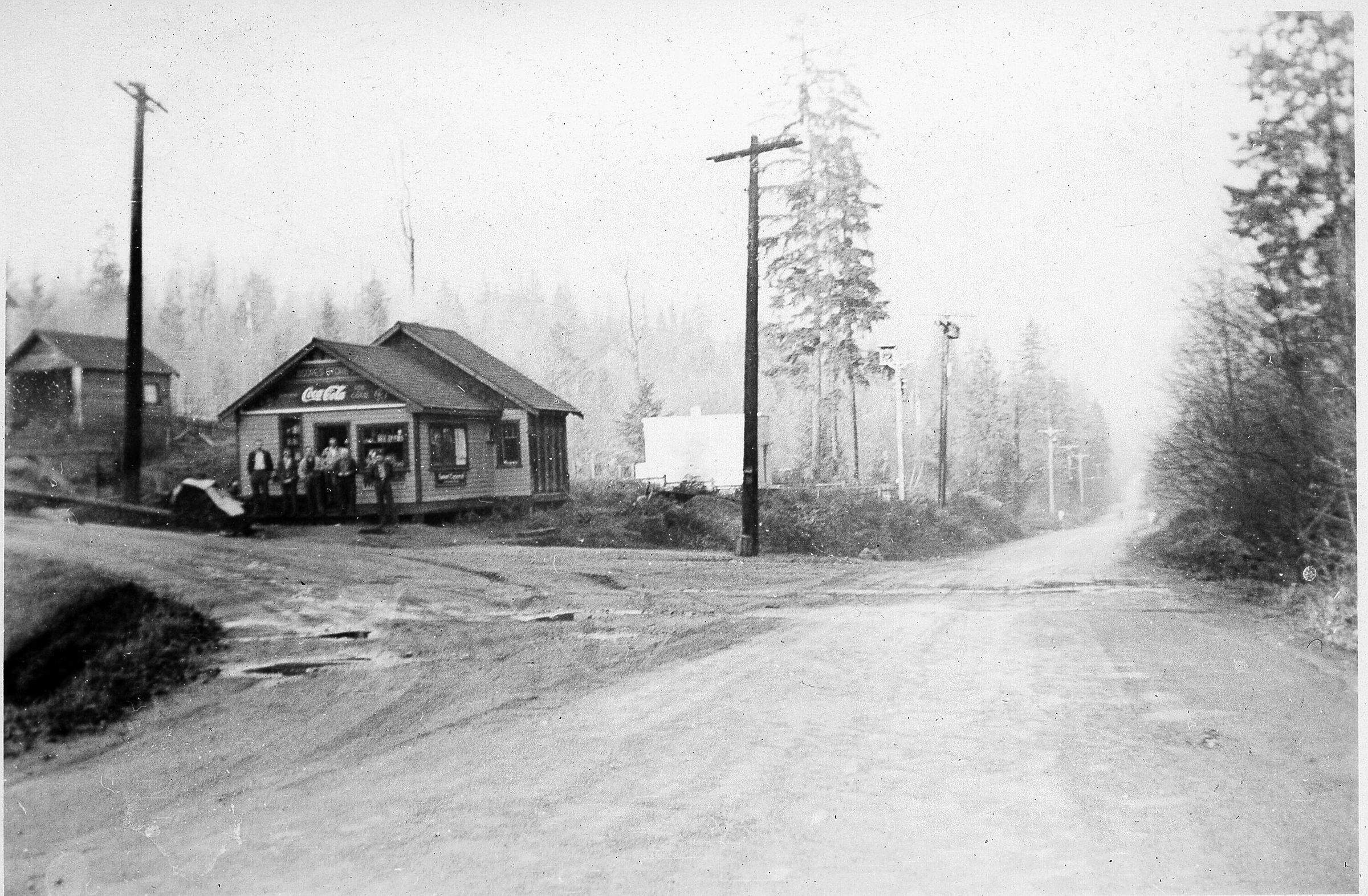 0100 - Moore's Grocery Store 1937. Corner of Keith and Deep Cove Rd. People standing outside of store, with Coca Cola Sign.