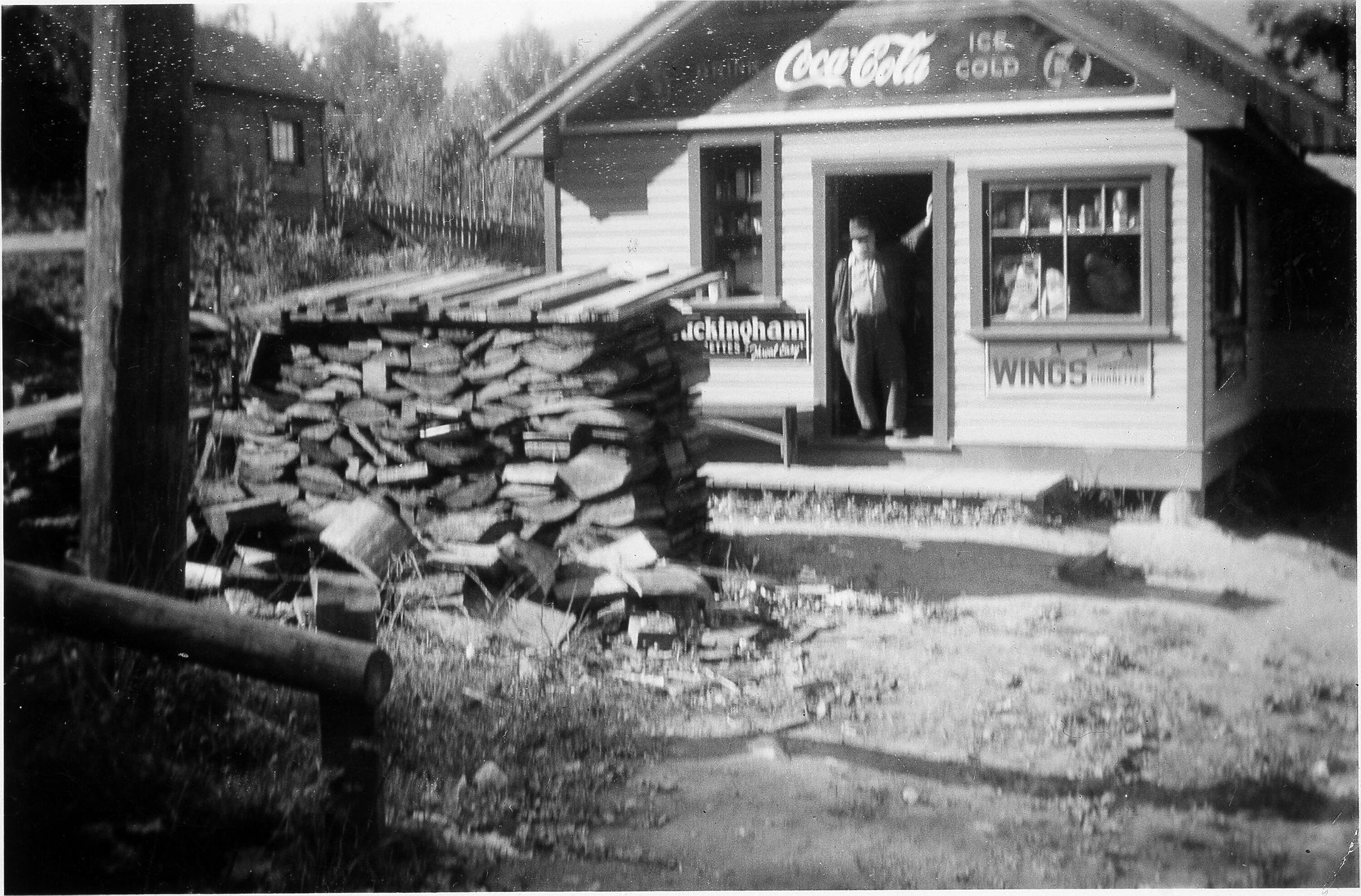 0107 - Mr Moore in store doorway. John Moore leaning against dooryway of Moore's Grocery Store located by Moore's Second Homestead.