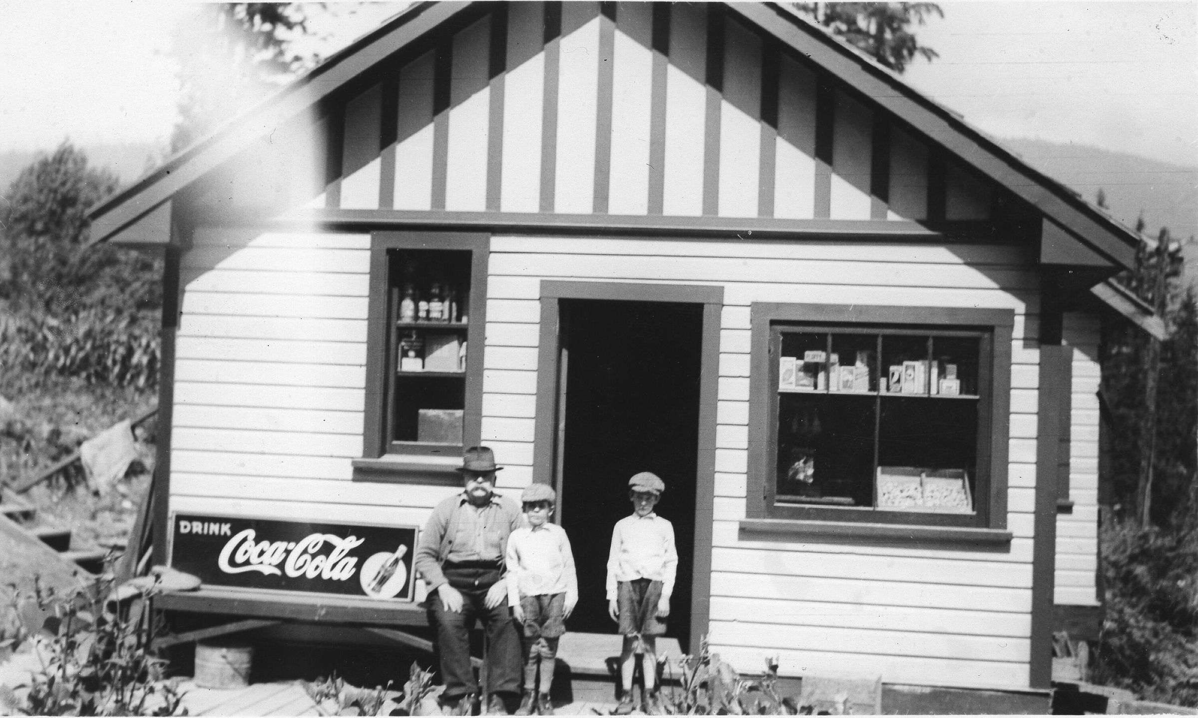 0108 - Mr Moore with sons Tom and Jim in front of Moore's Grocery Store.