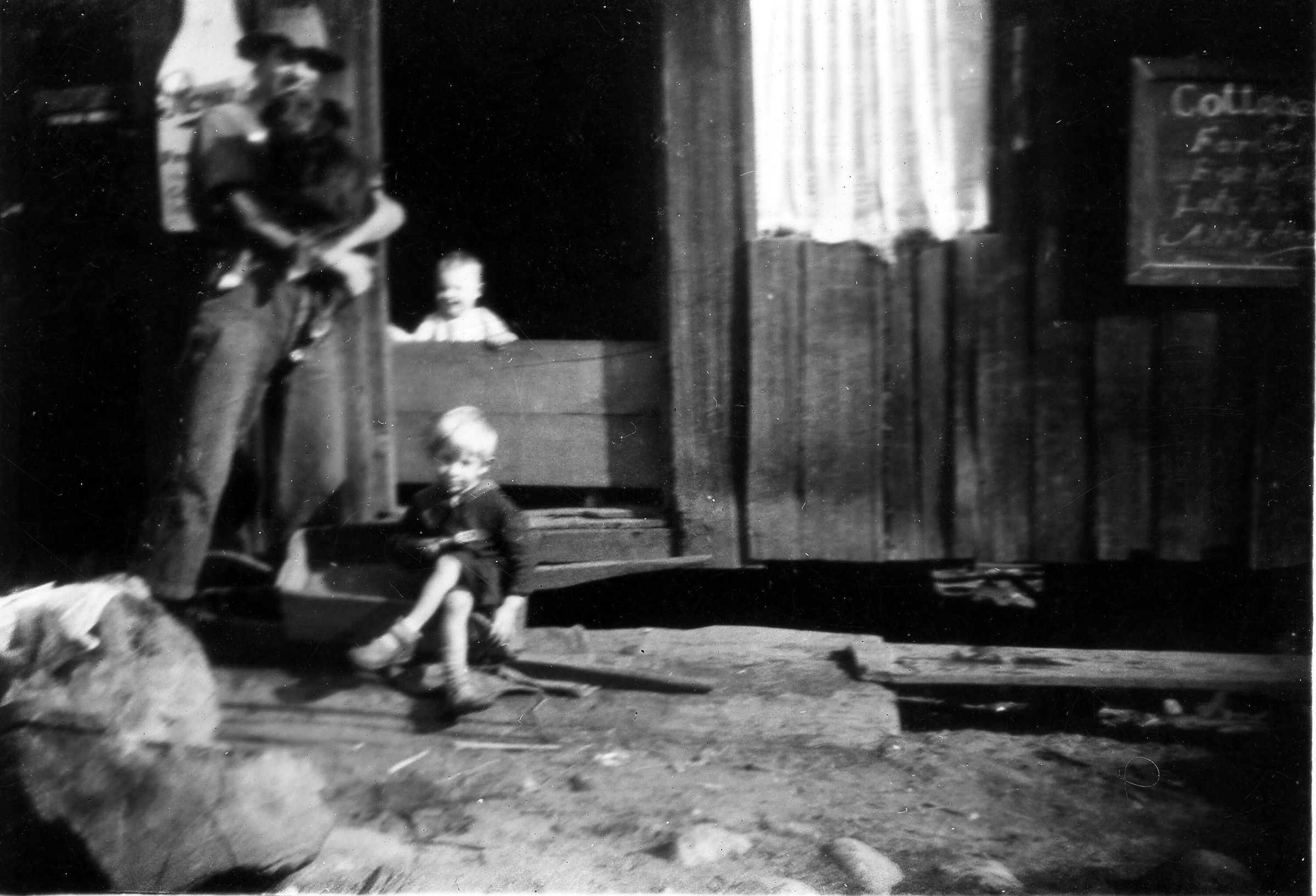 Close up of storefront, Moore's Store, with man holding black dog. One child in door way and another sitting on step, all looking at camera .Collection