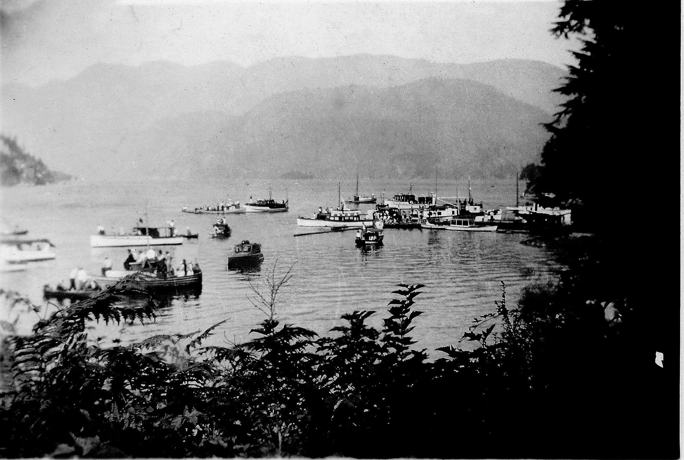 Image looking out into cove, shrub in foreground. Boats out in cove/' harbourCollection