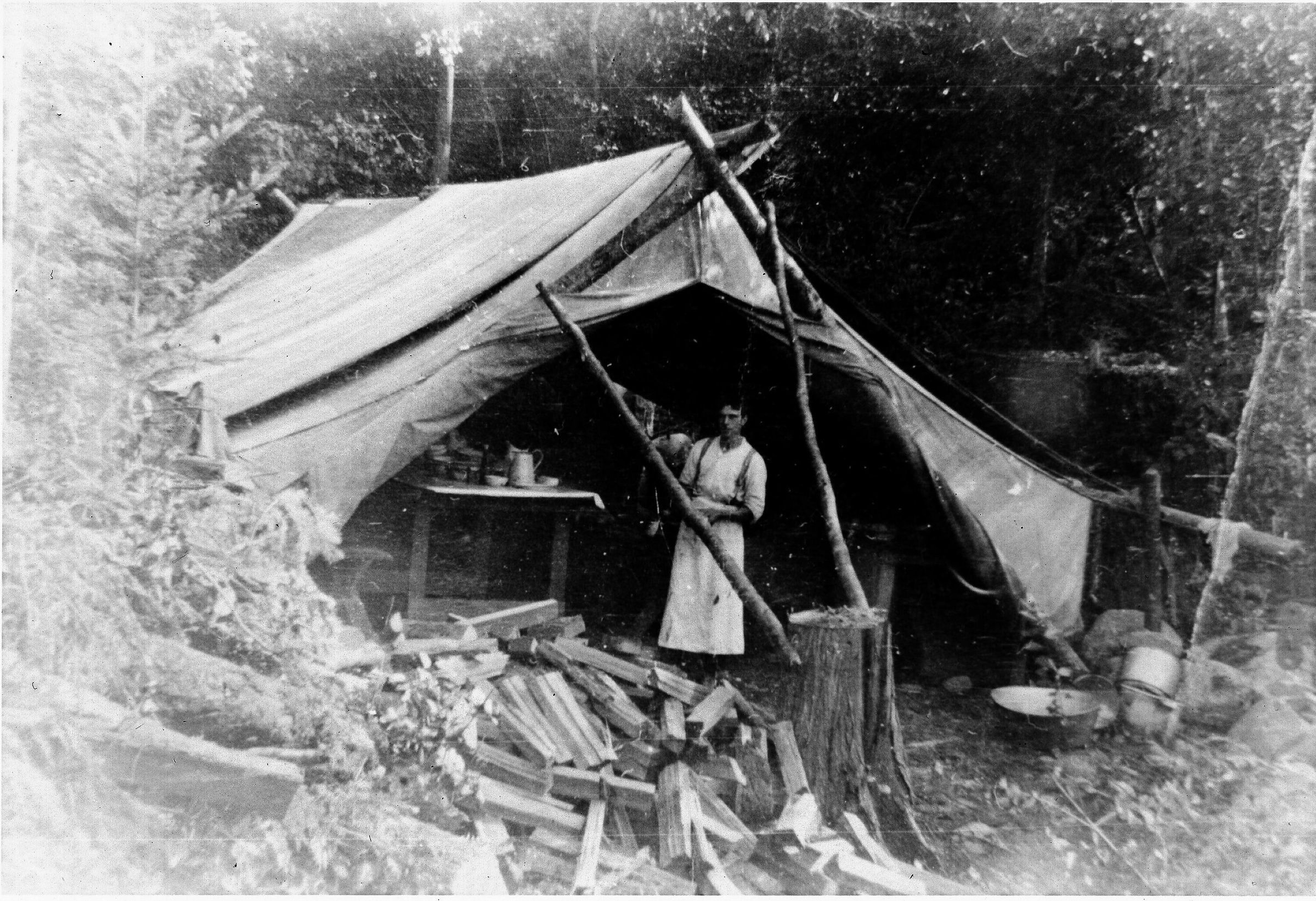 0116 - Young man in front of cook's tent. Man outside of large cook tent, holding a large branch/' stickCollection