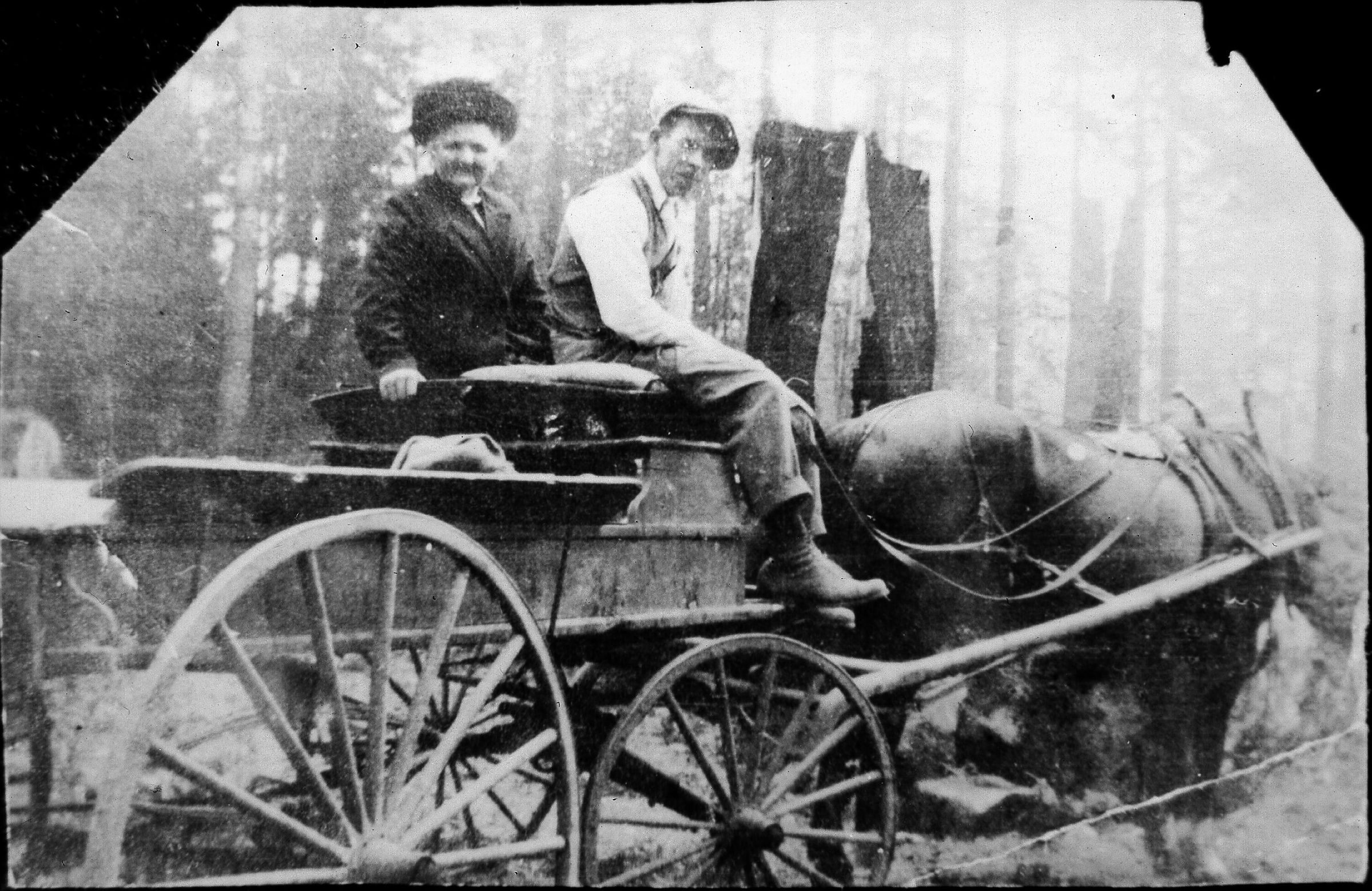 0117 - Delivering food to Woodland's road gang. Two people lookinjg at camera ( in tent?) on top of wagon pulled by horse.