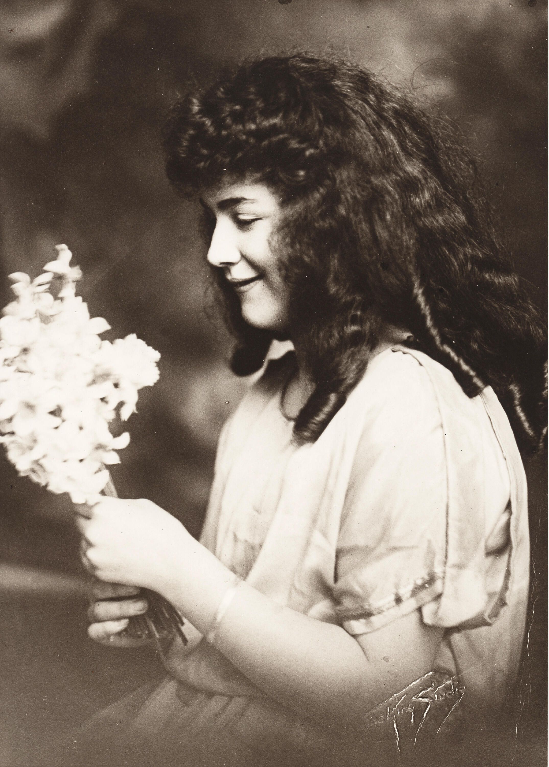 Black and Ehite image of profile portrait of Ethel Marshall, Roche Point May Day Queen, holding s bouquet of flowersCollection