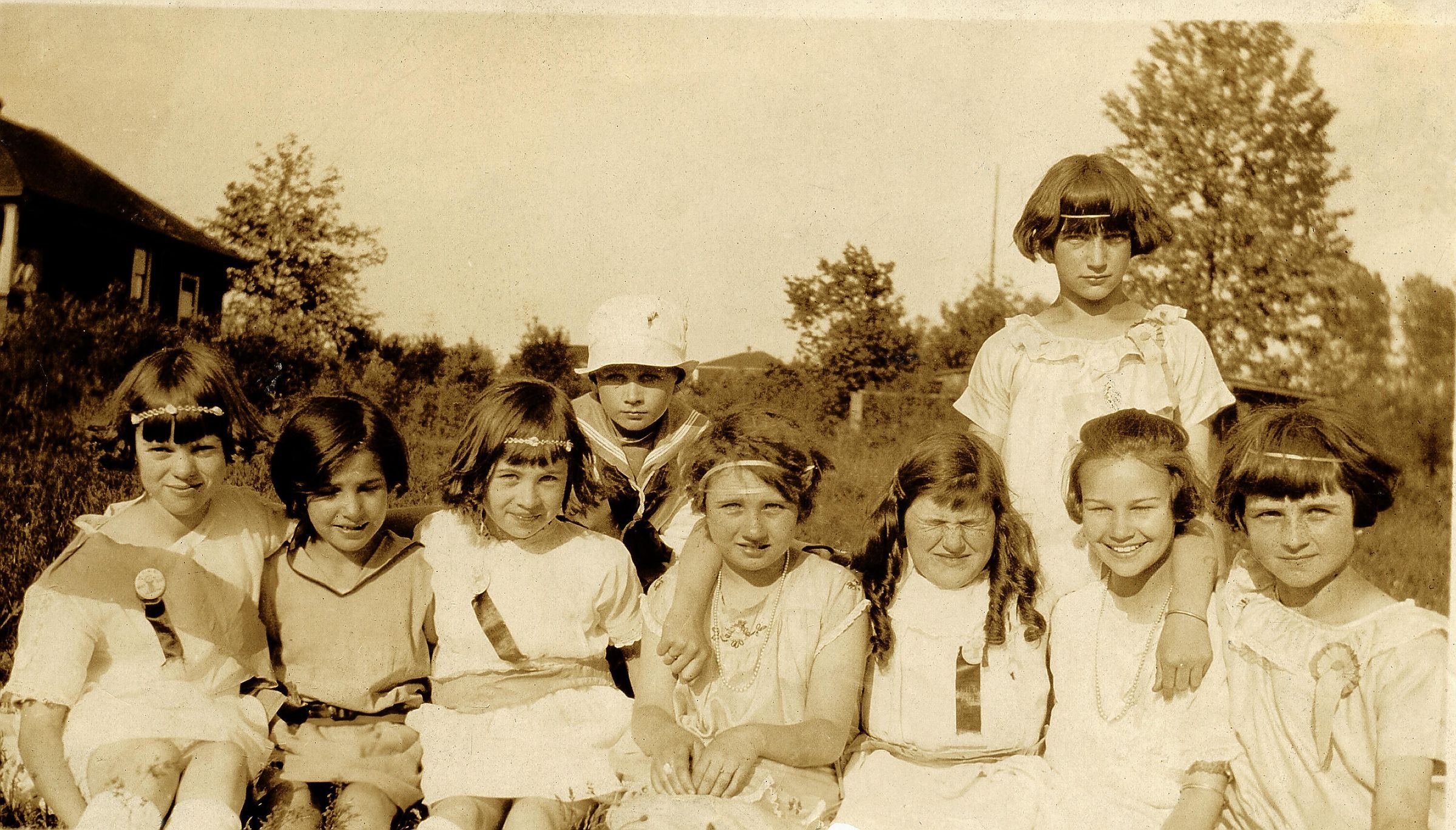 0127 - Students, Maypole III at Mahon Park. Sepia toned image of group of 9 young students (mainly girls) gathered for a portrait. Wearing various ribbons and sashes.