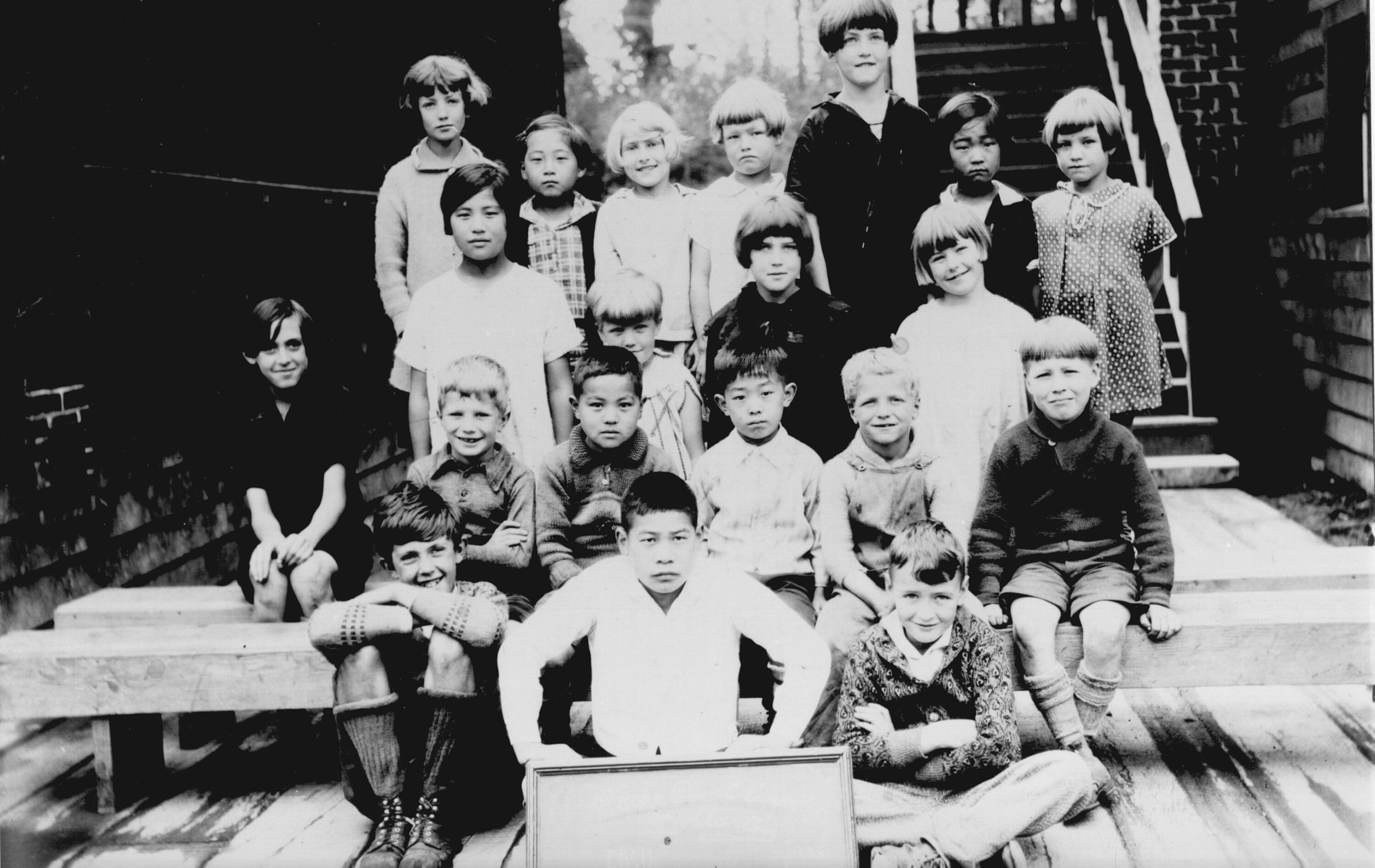 Black and white photo of Class, four rows, Girls standing in back two rows, with boys sitting on bench and ground two front rowsCollection