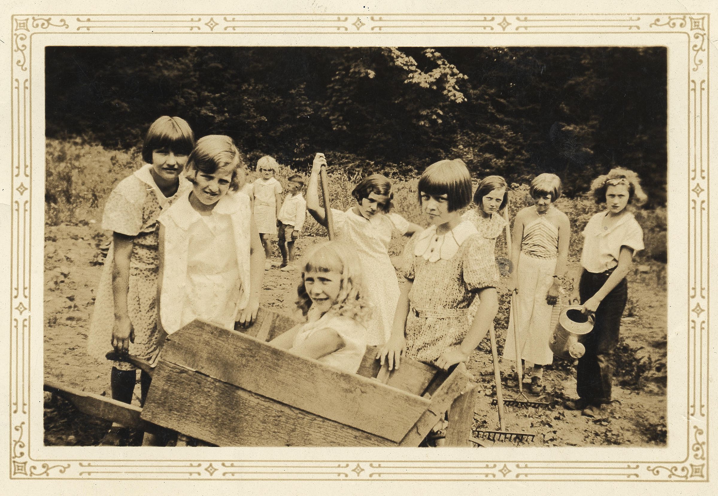 Framed Sempia image of group of students in the garden. Girls in front of standing around one girl sitting in a wheel barrow. All of the students are staring at camera.Collection