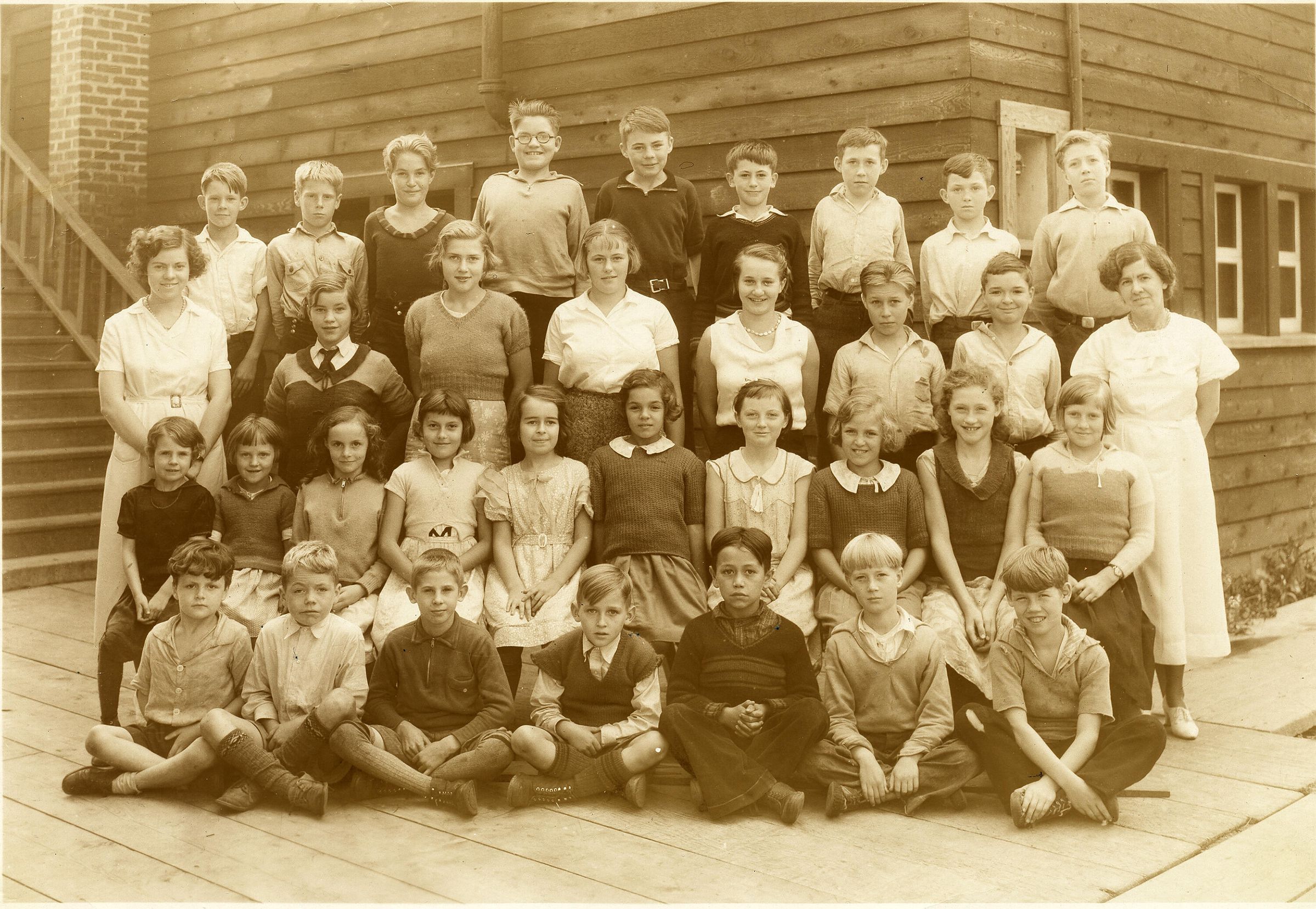 4 rows of students. With two young women teachers standing on either side.
