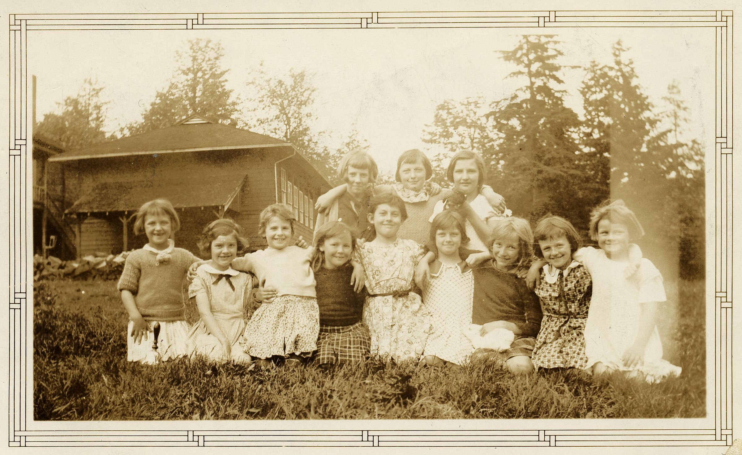 0155 - Roche Point 12 students. 13 students sitting on the ground looking at staring and smiling into the camera. School is background.