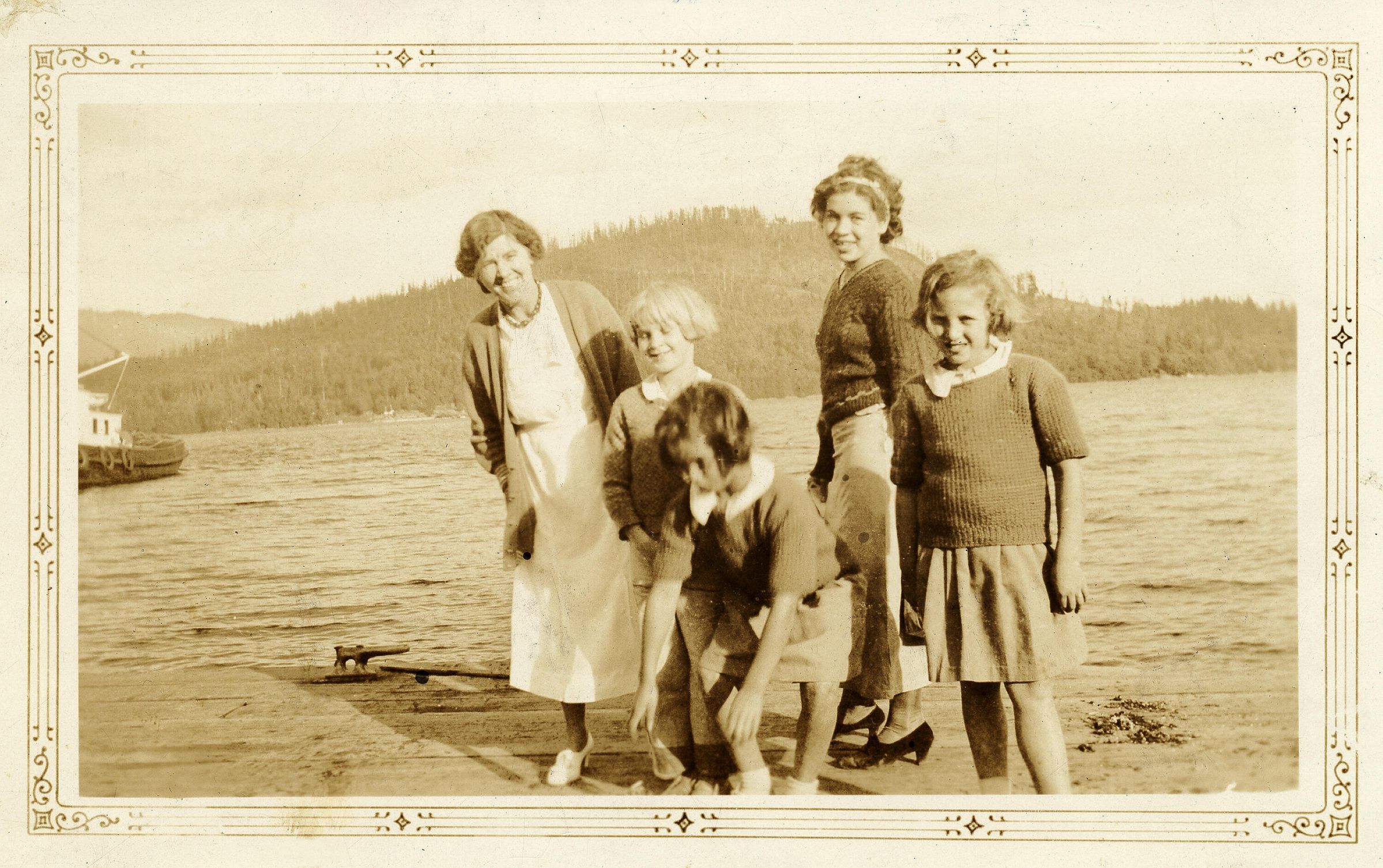 On Dollar Mill Wharf, teacher & students, c1932Description