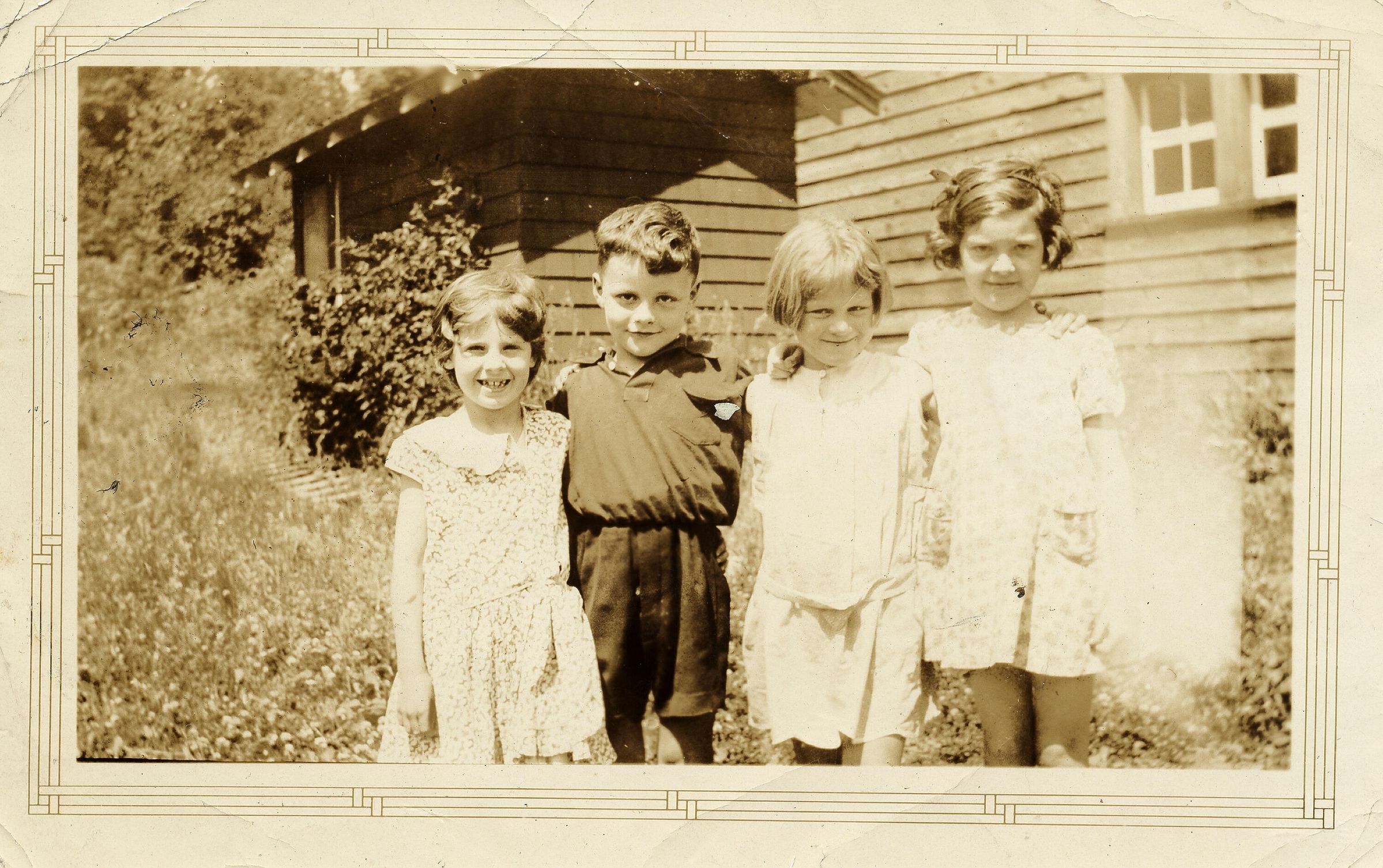 Framed sepia image. Four students look into the camera (3 girls and 1 boy)