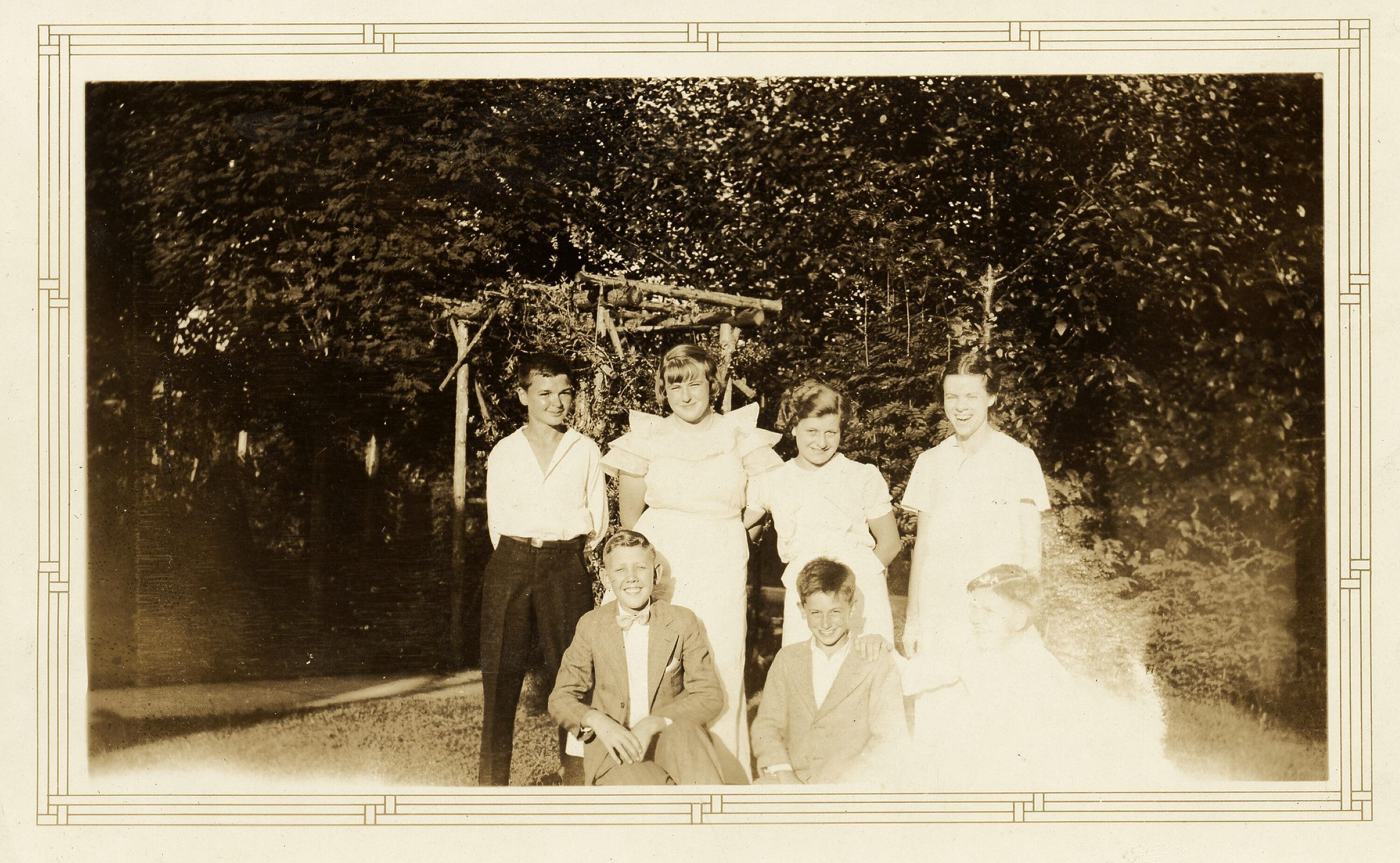 Framed sepia print of 7 young people gathered for a picture in yard.Collection