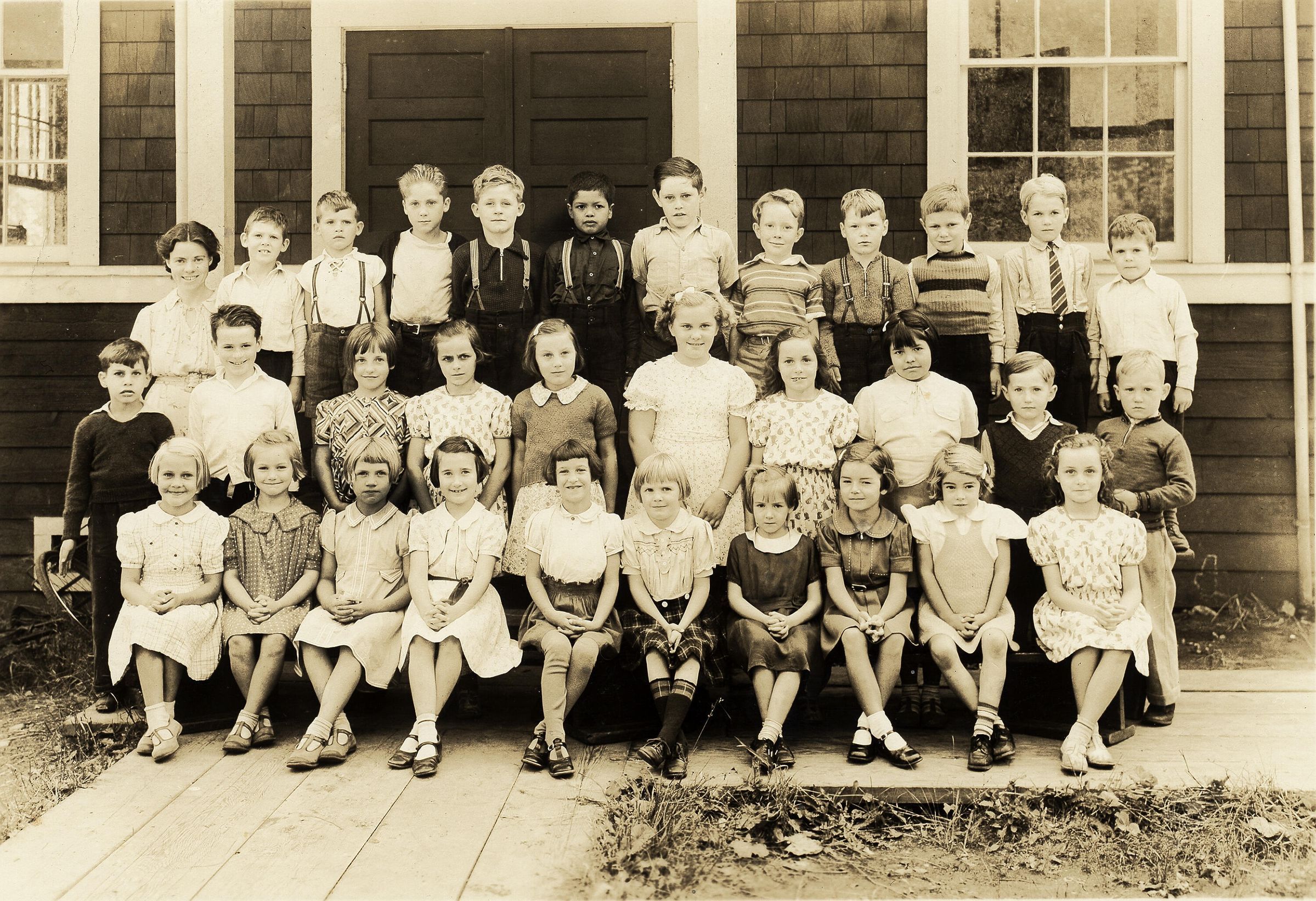 0162 - Roche Point School class photo Sepia photo of class in front of school.