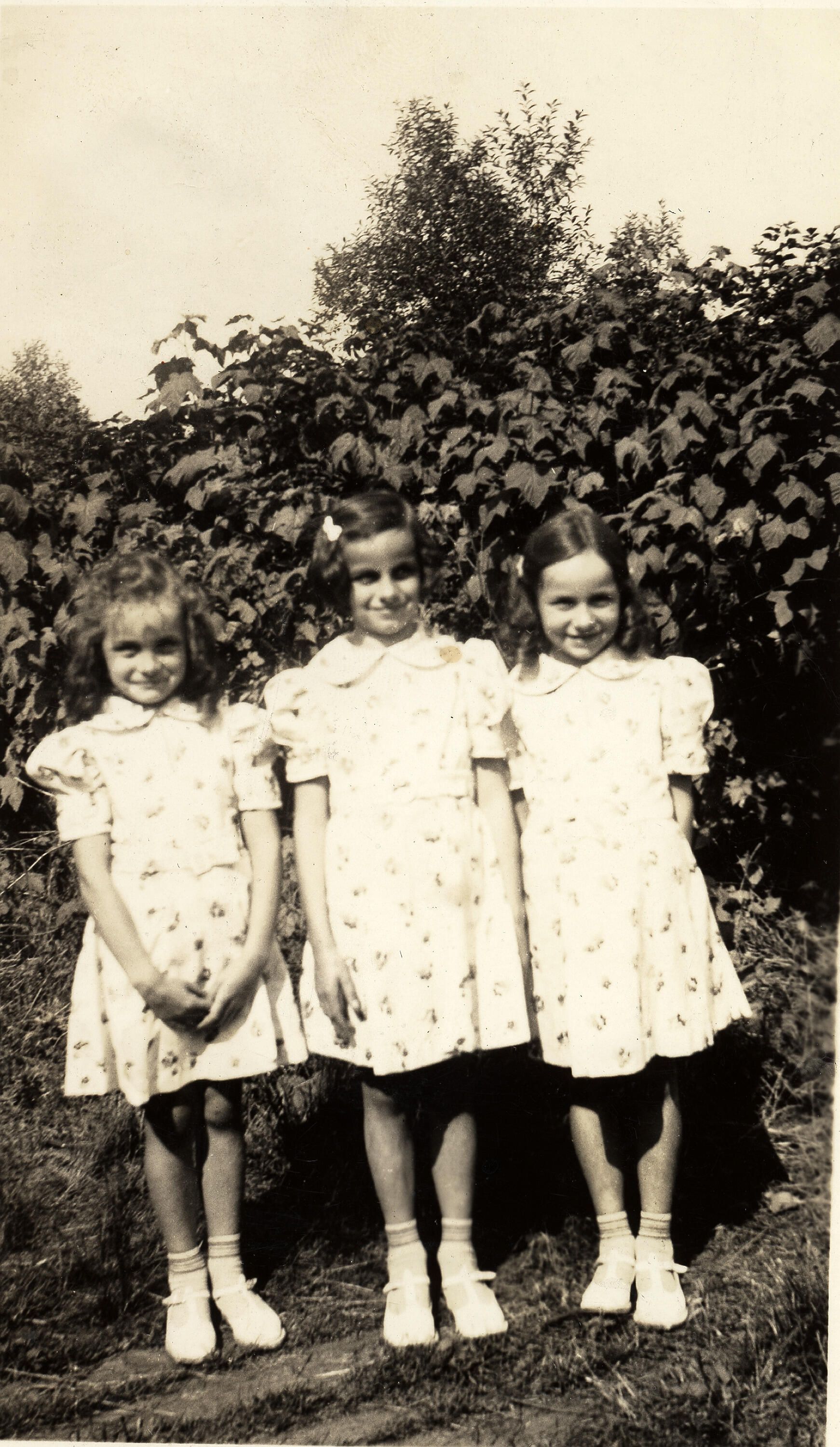 Sempia photo of three girls in matching dresses smiling at camera.Collection