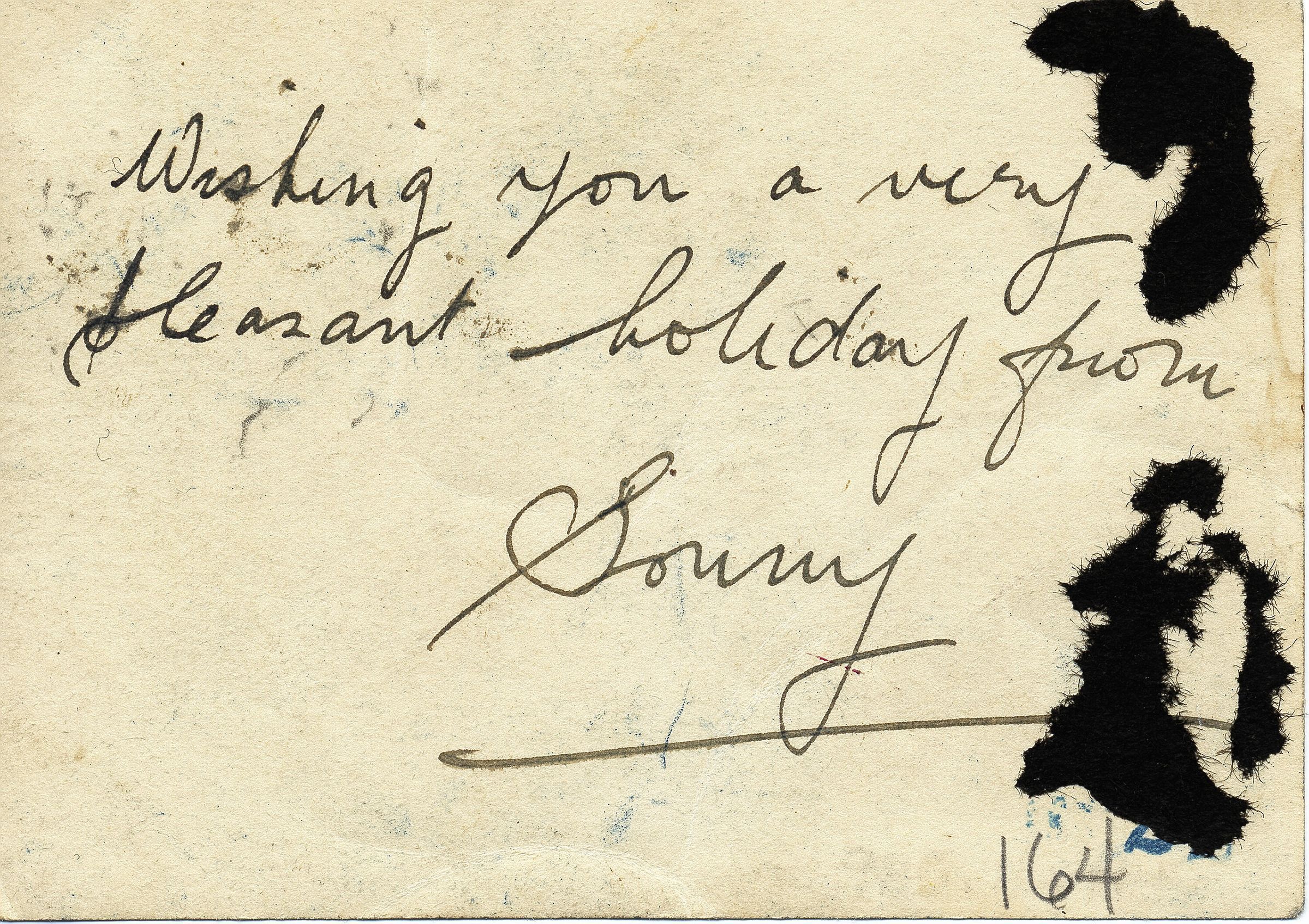 Sempia photo of small boy, Alec Barclay. Smiling at the camera in yard. On back handwriting "Wishing you a very pleasant Holiday, from Sonny"Collection