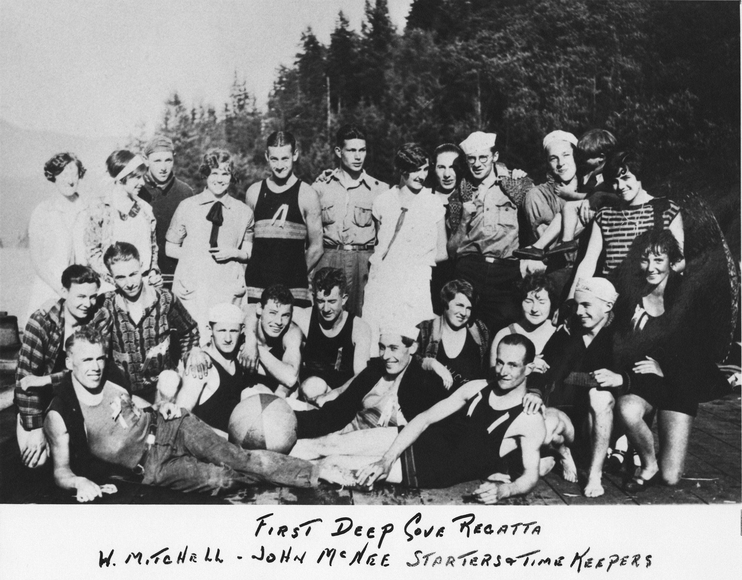 In black writing below picture: " First Deep Cove Regatta" E Mitchell, John McNee, Starters + Time Keepers"Collection