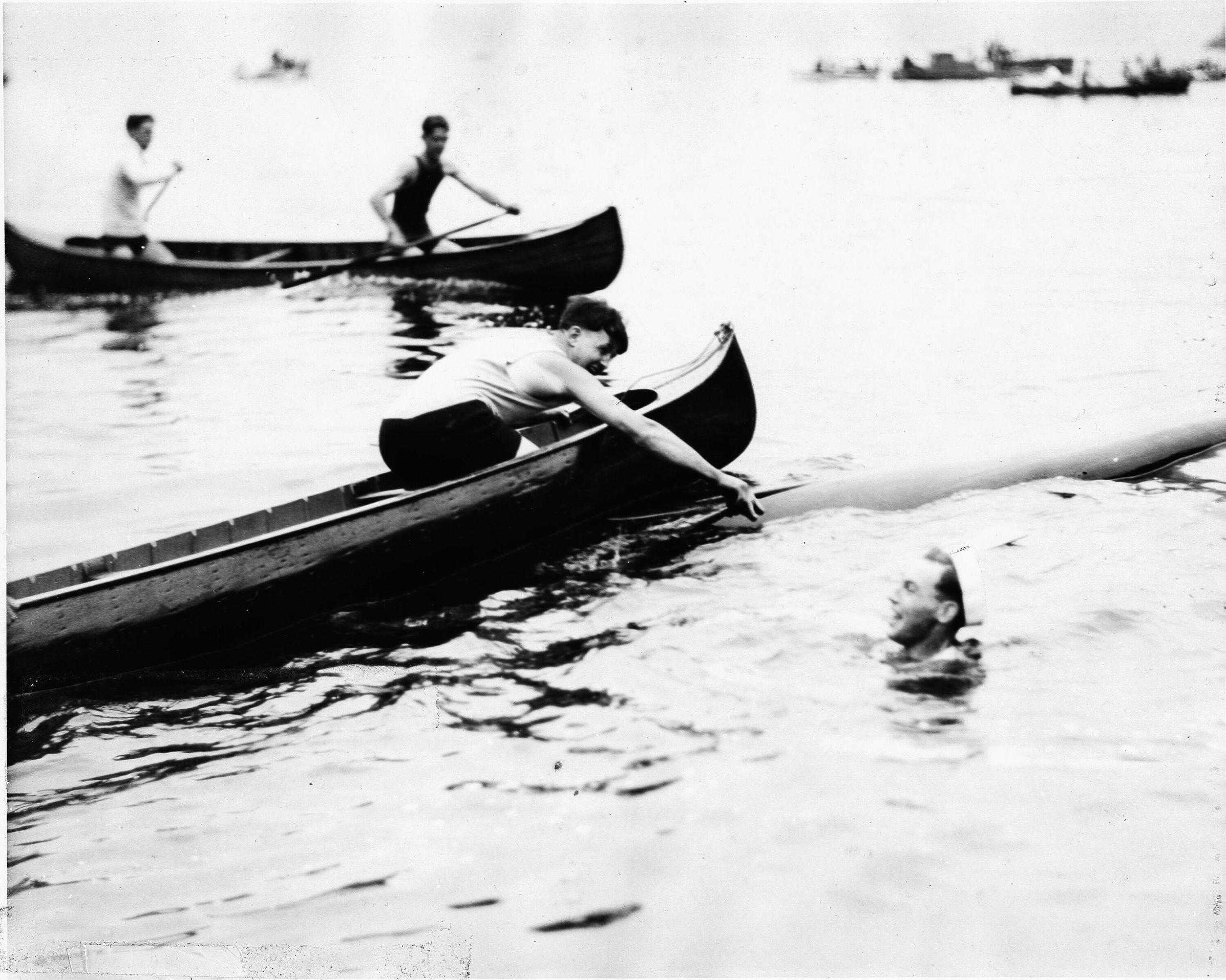 Black and white image of close up of Canoe tilting outcome. One man in water, as another man in a canoe gives him a hand. Two men in one canoe paddle into frame in the background.Collection