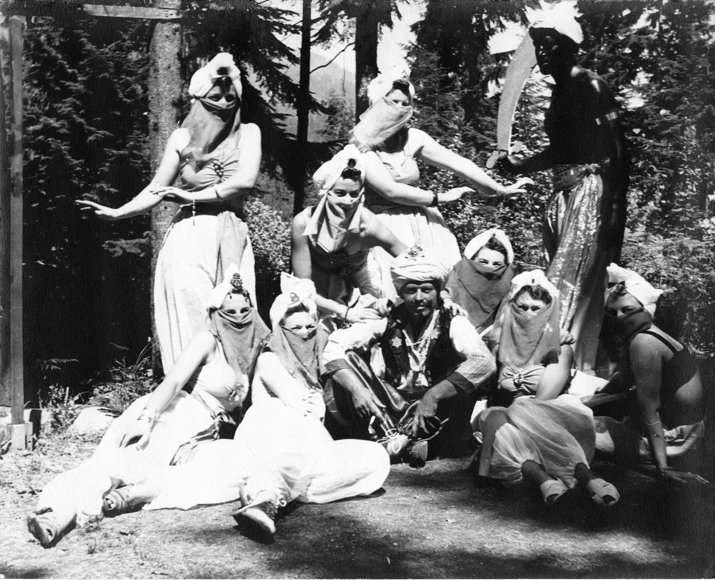 Black and Image of a group of people in custom. Man surrounded by " harem" of women. Dressed inCollection