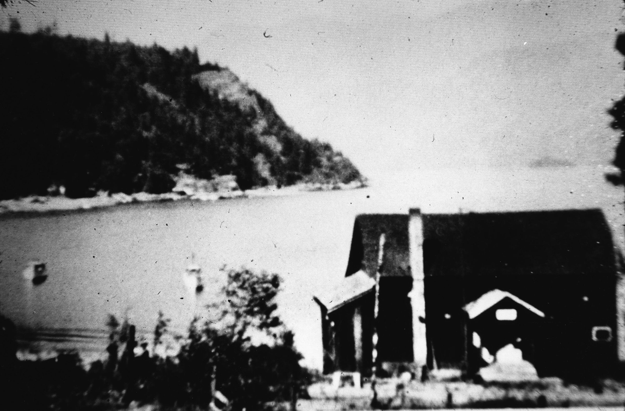 Black and White image looking out at cove, with Quarry Rock in the background. Yacht club in the foreground.Collection
