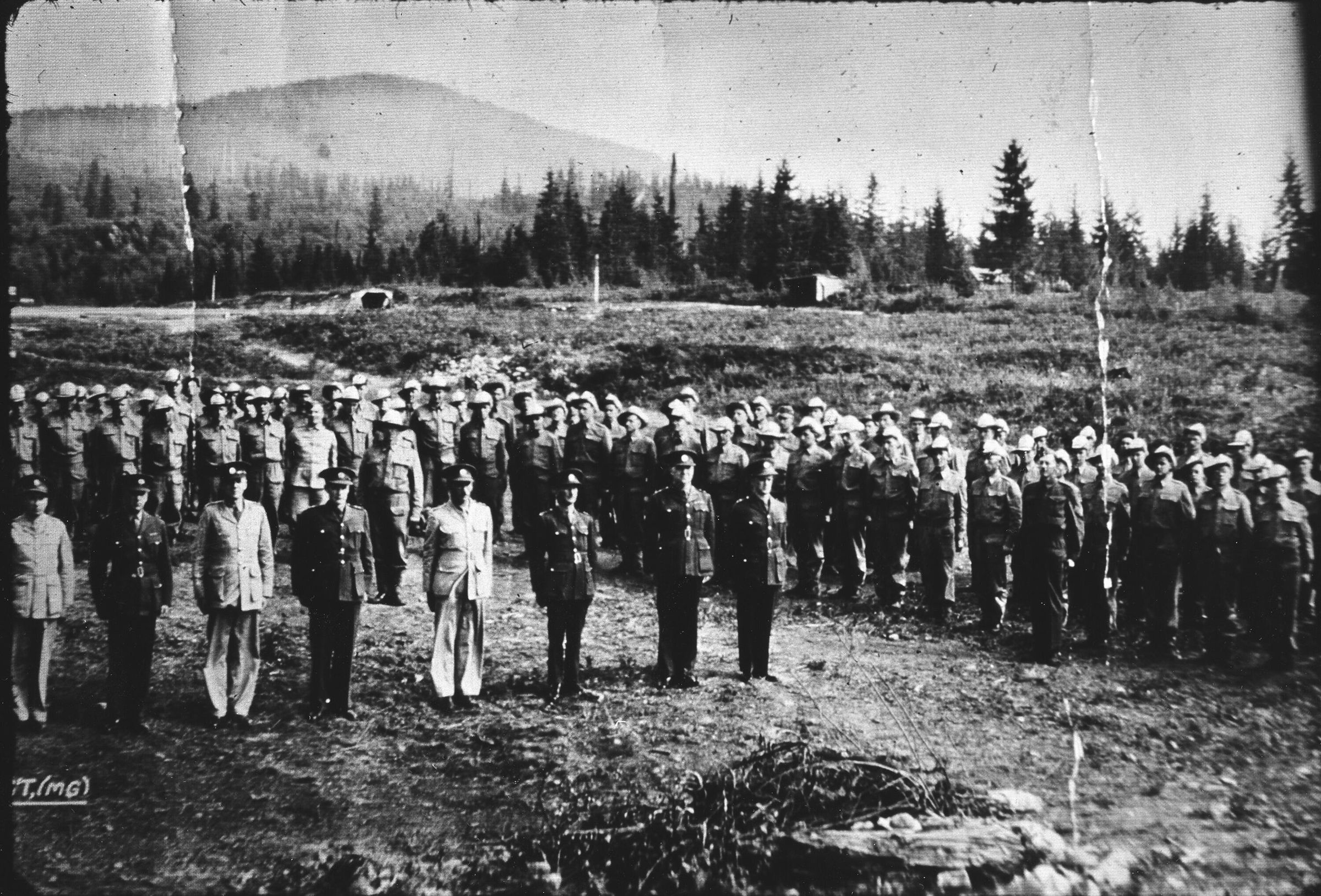 Black and white photo of men standing in line/ form, presenting themselves to camea.