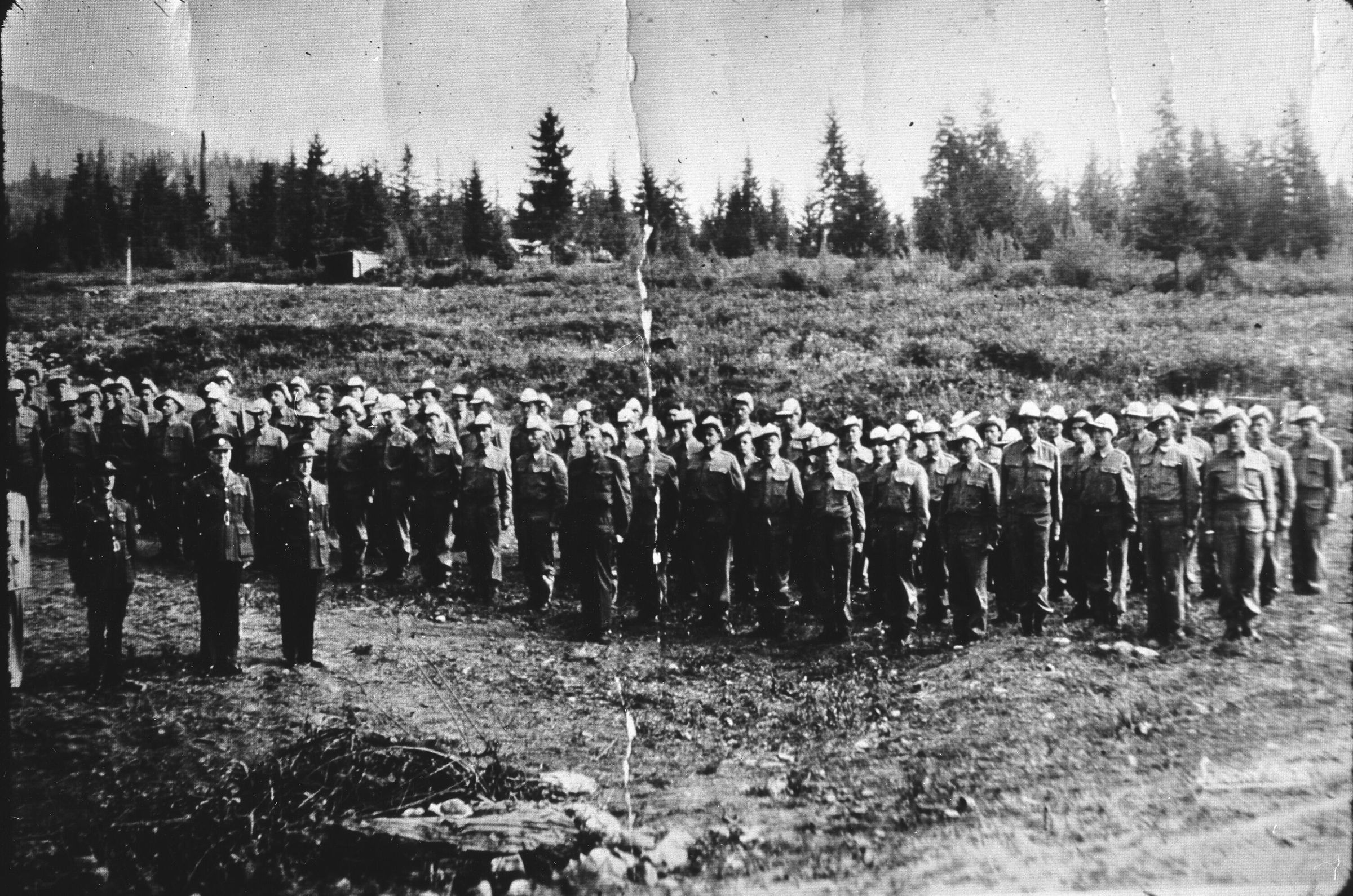 Black and white photo of men standing in line/ form, presenting themselves to camea.Collection