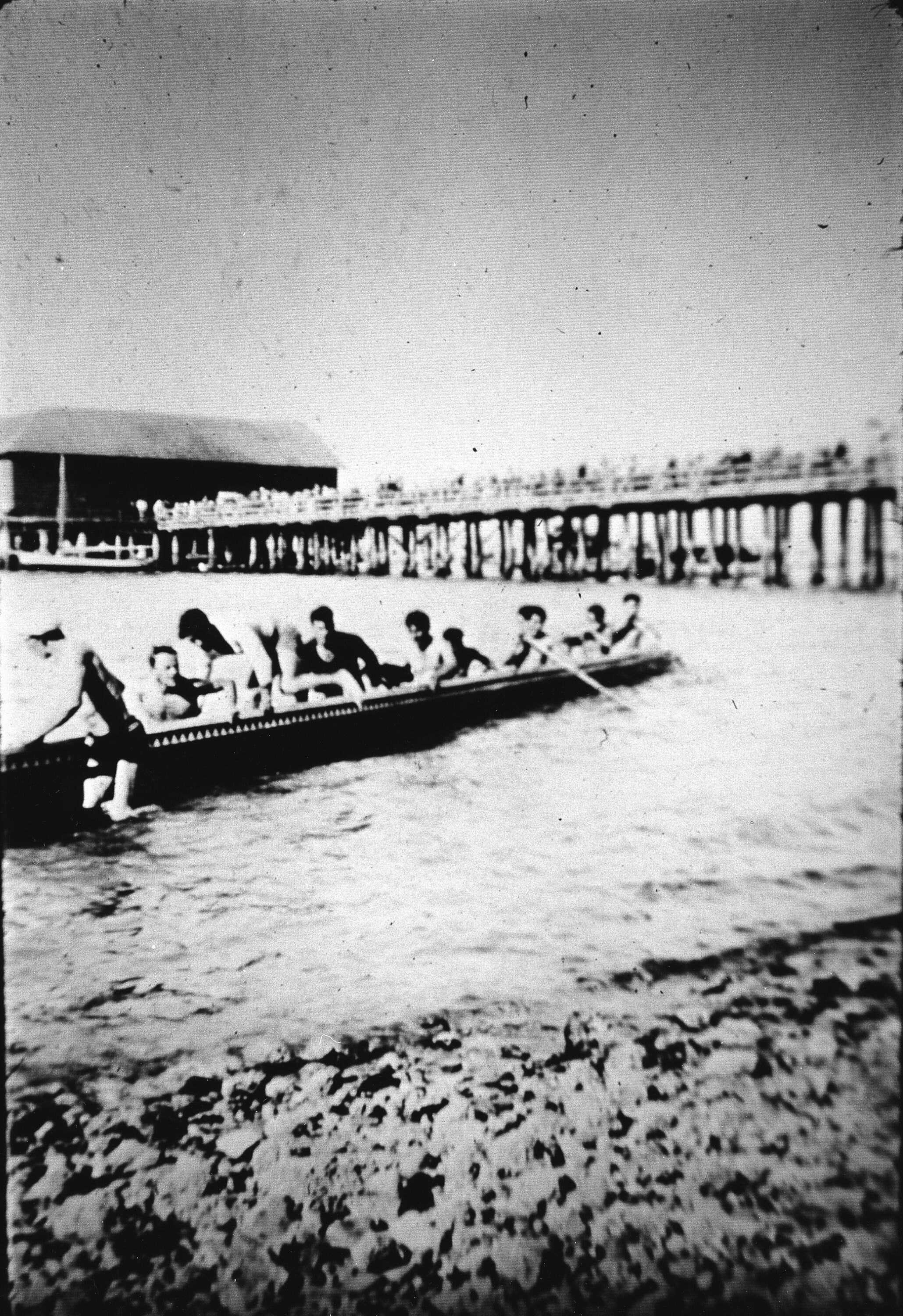 Black and white image of canoe team at shore on inlet, with members either climbing in or out . Dock with boathouse in background.Collection