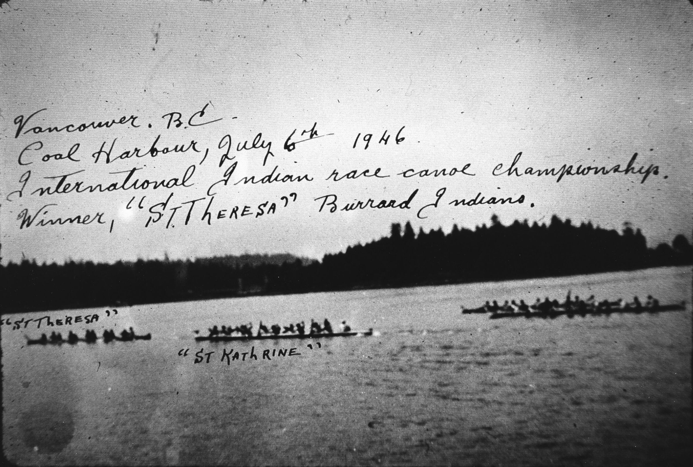4 canoes seen racing in the distant,. Black script written on photo " Vancouver, BC. - Coal Harbour, July 6th 1946 International Indian race canoe championships. Winner, "St. Theresa" Burrard Indians."Collection