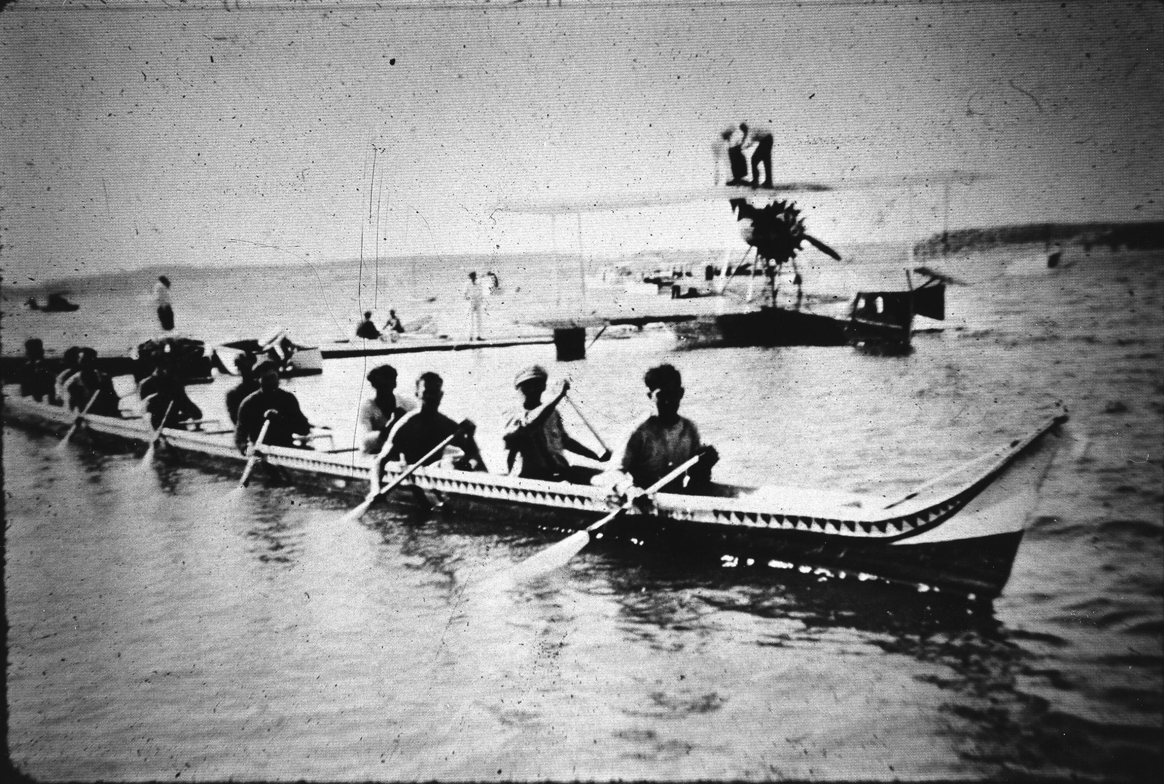 Black and white image of canoe team in canoe looking at camera, with float plane in background.Collection