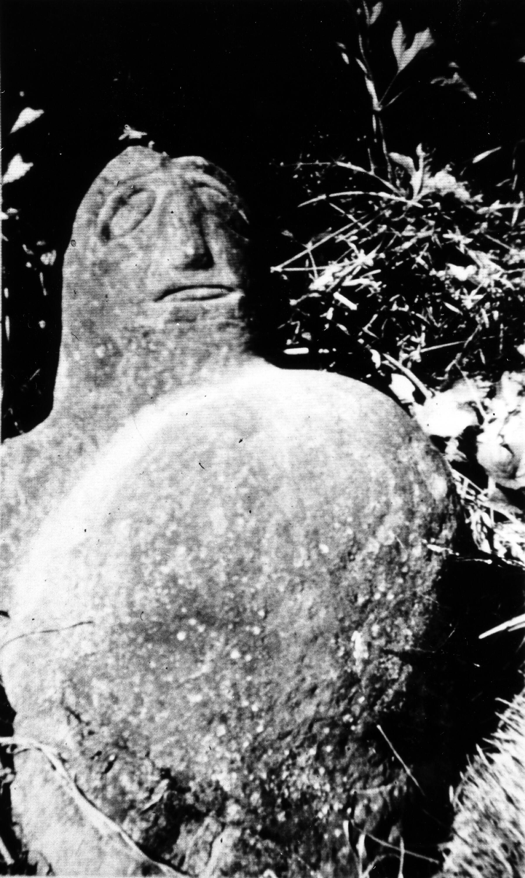 First Nations artifact Black and white image of artifact/ stone figure with face.
