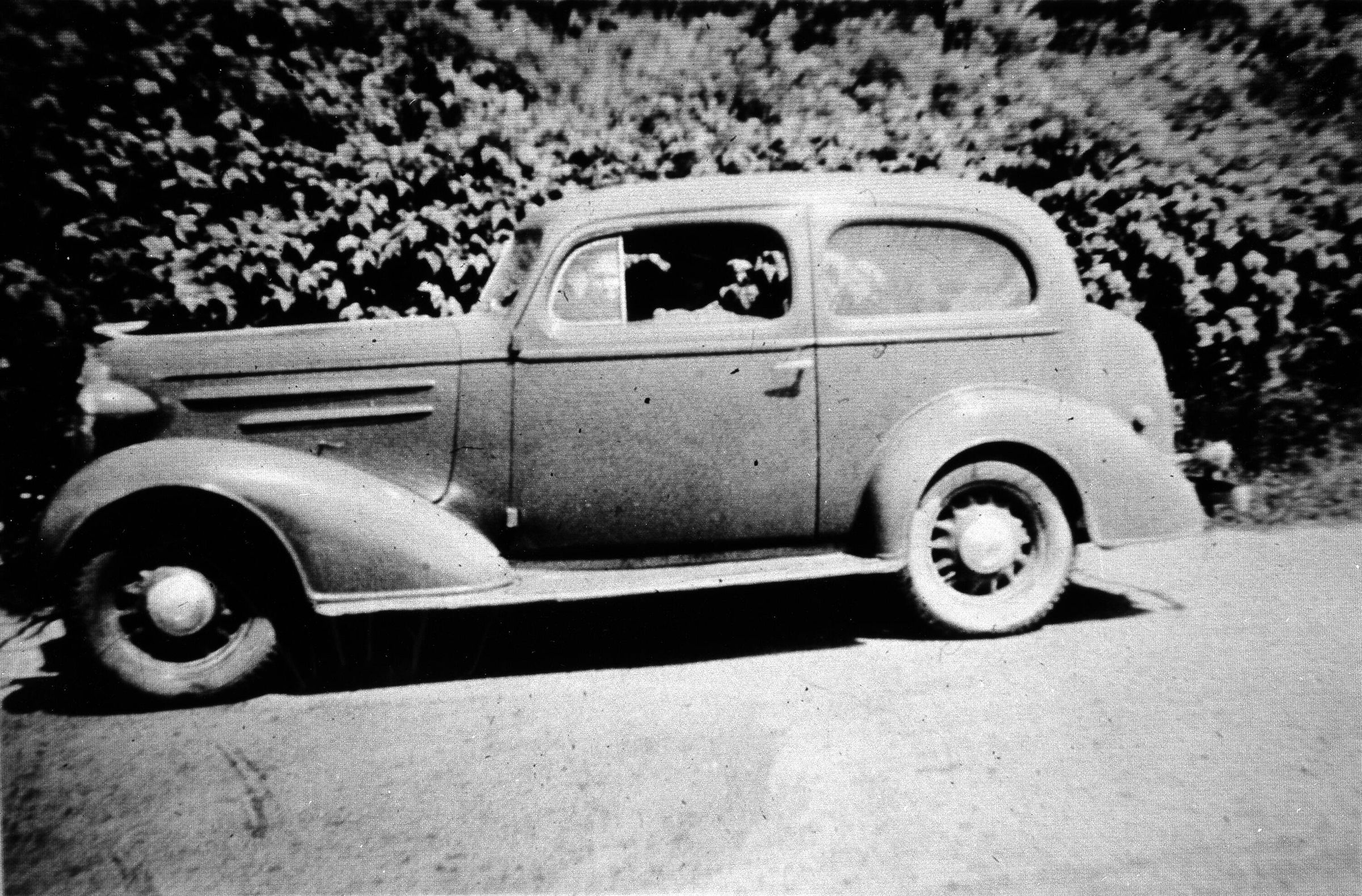 Black and white image of side profile of car parked along side of road with shrubbery in background,Collection