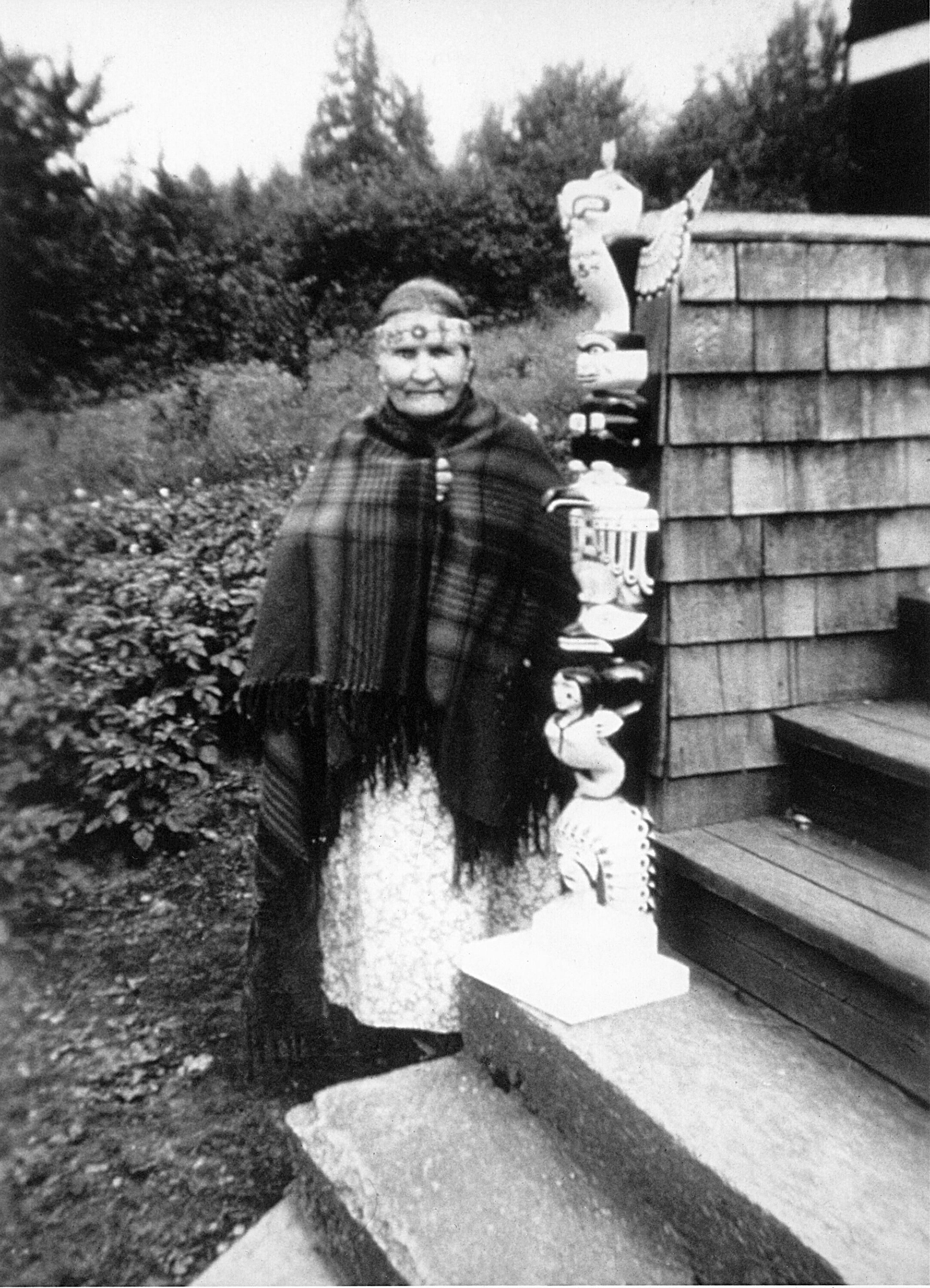 Black and White image of older women standing to left of stairs with small scale total pole on step to her immediate left.Collection