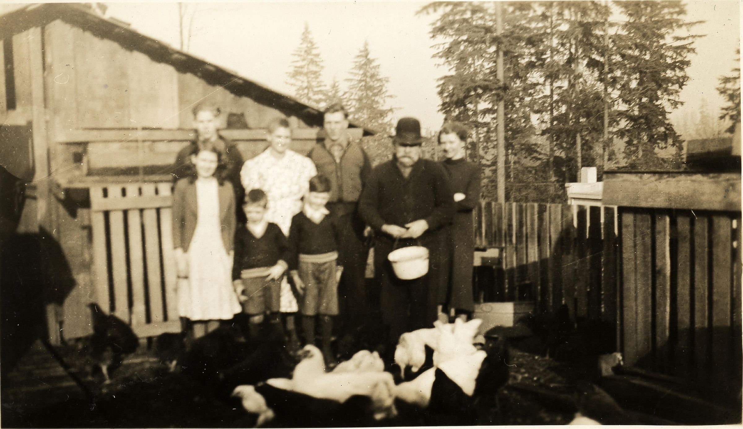 Sepia image, with John Moore sitting infront of store door with two sons flanking himCollection