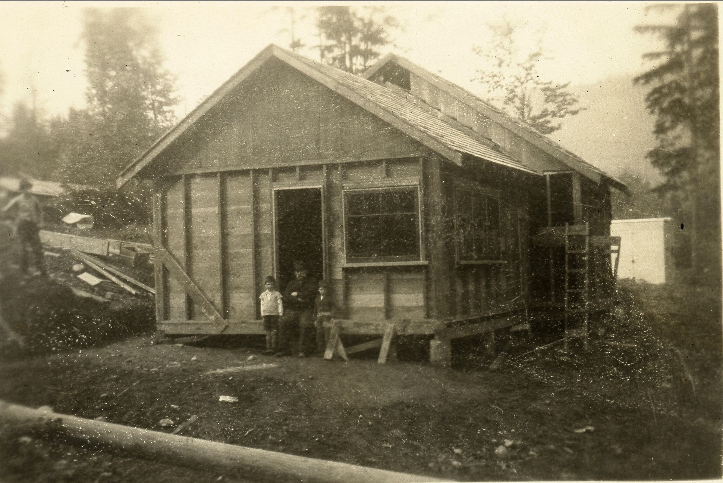 Black and white image looking across the street at Moore Store with 'Coca Cola' sign and House with seperated shed a little bit up from the Store.Collection