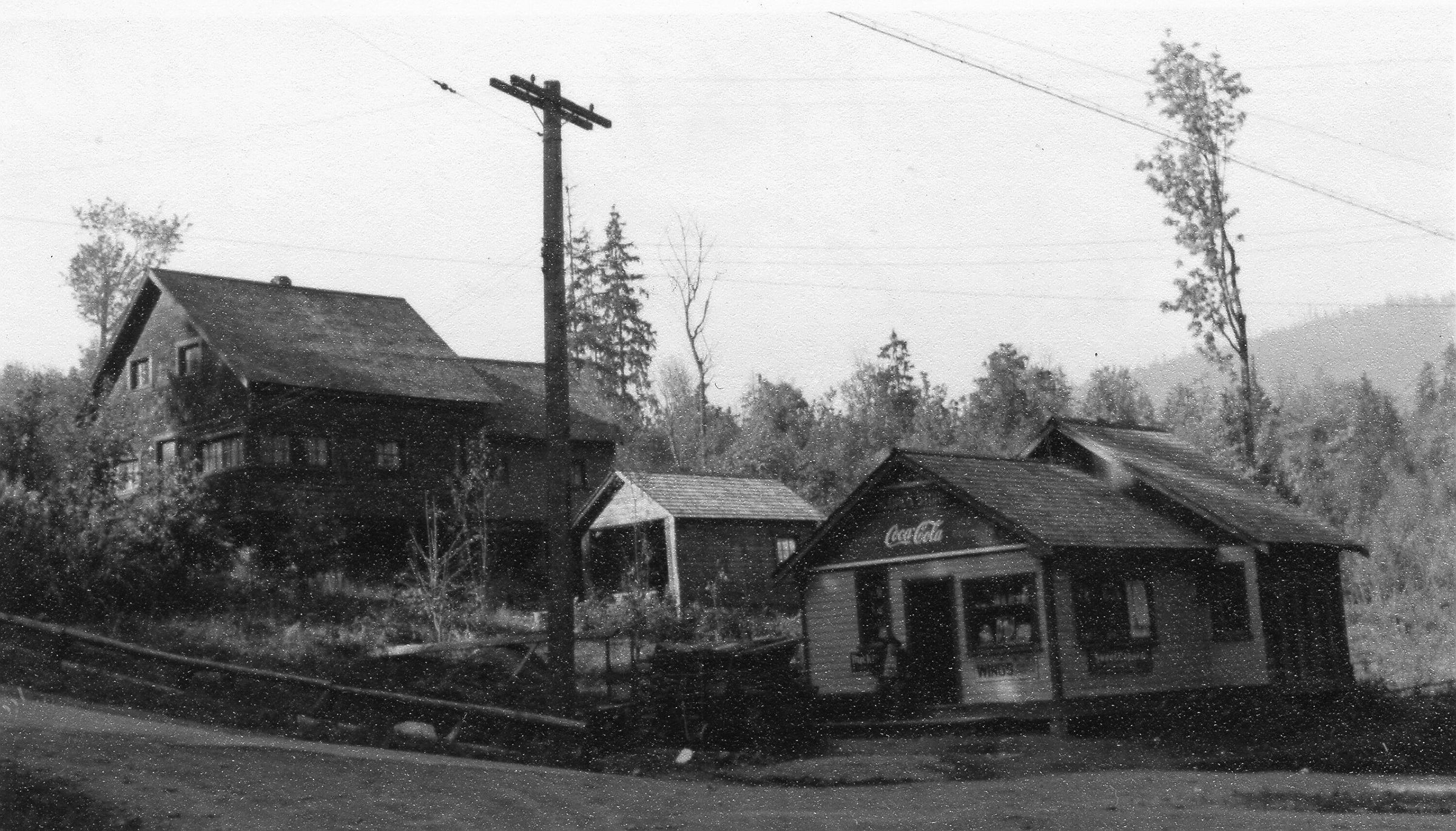 Quarries bunkhouse Vertical image with Bunkhouse in background. Lawn with dog in center of image.
