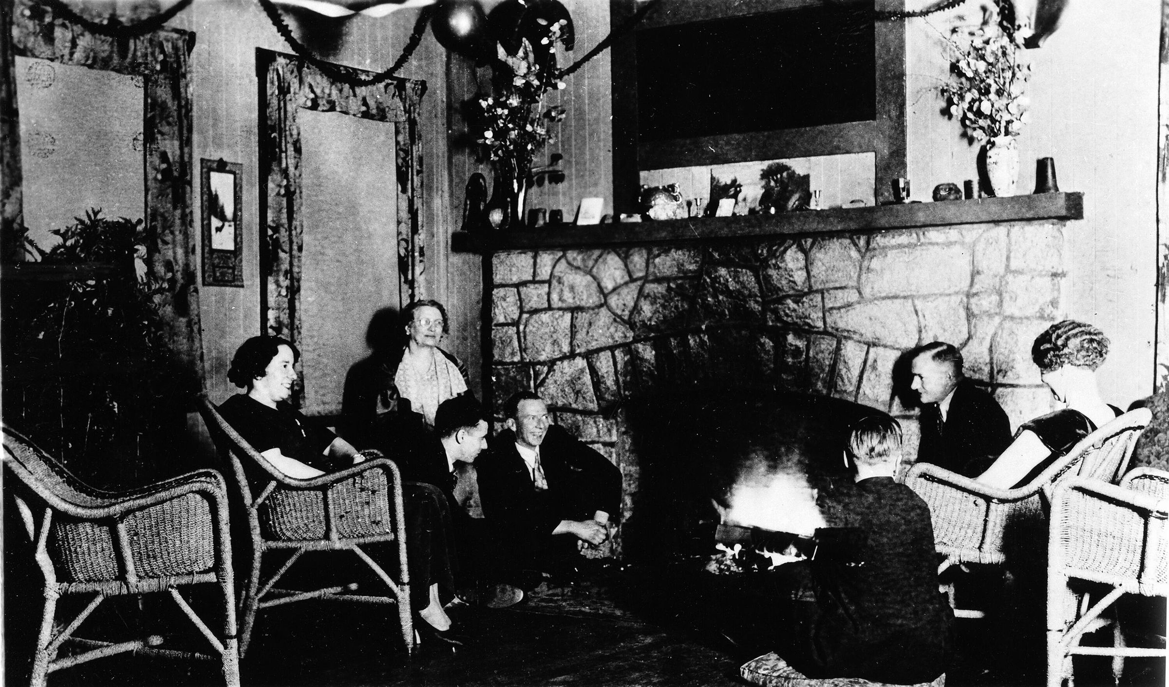 Black and white - indoor candid scene of a group of people (guests) sitting around a fire in a lodge living room. Men sitting on ground, and women sitting in chairsCollection