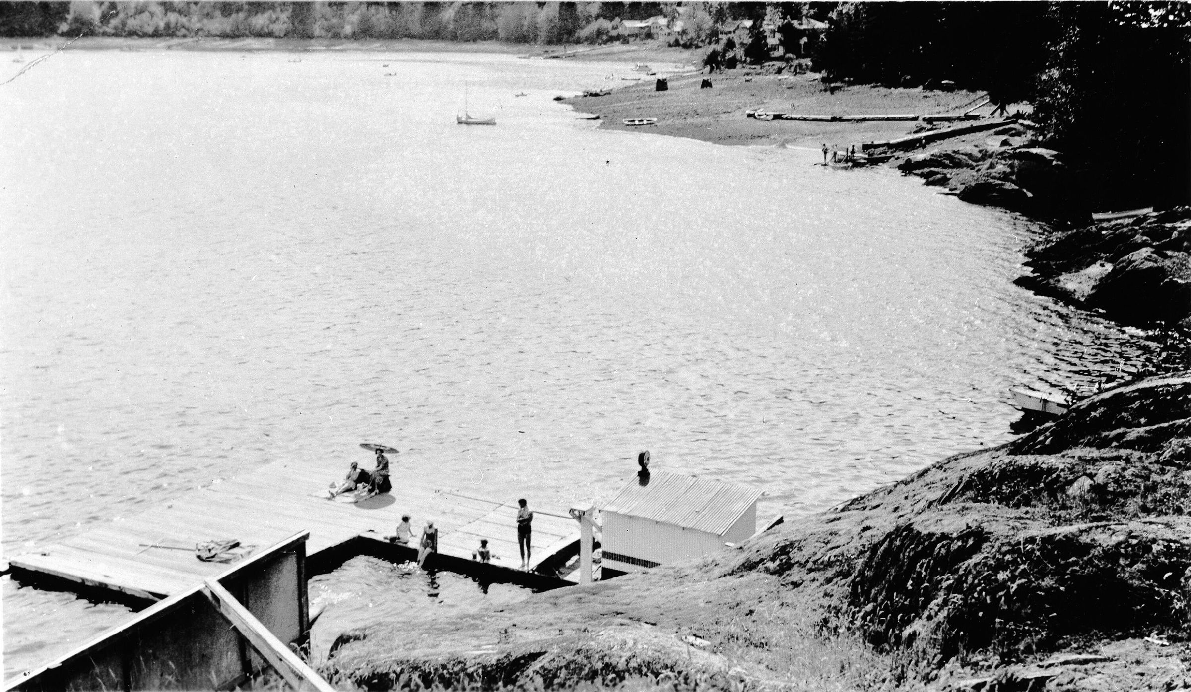 Black and white image looking down towards dock with the shoreline to DeepCove in background.Collection