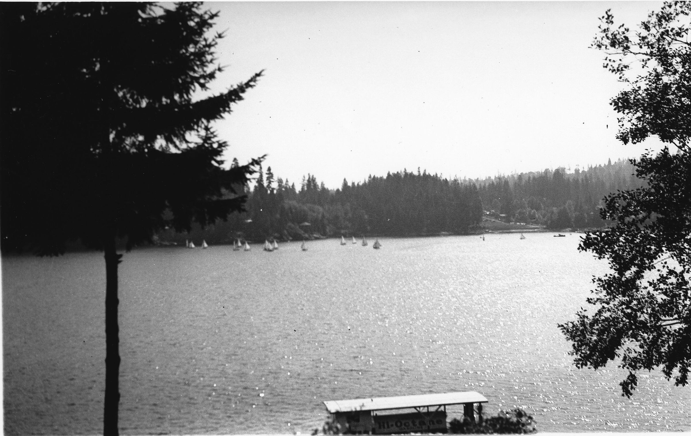 0304 - George's Marina with High Octane sign showing at bottom of image. Sales boats and cove in background.