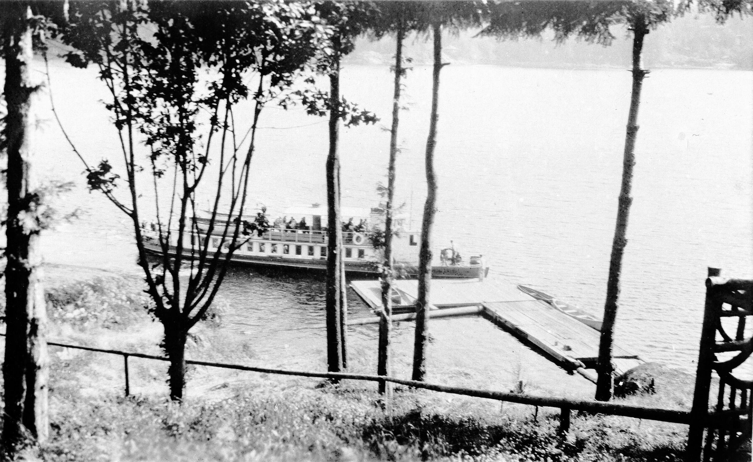 Black and white photo taken from Quarries logde looking down towards dock with a boat coming in.Collection