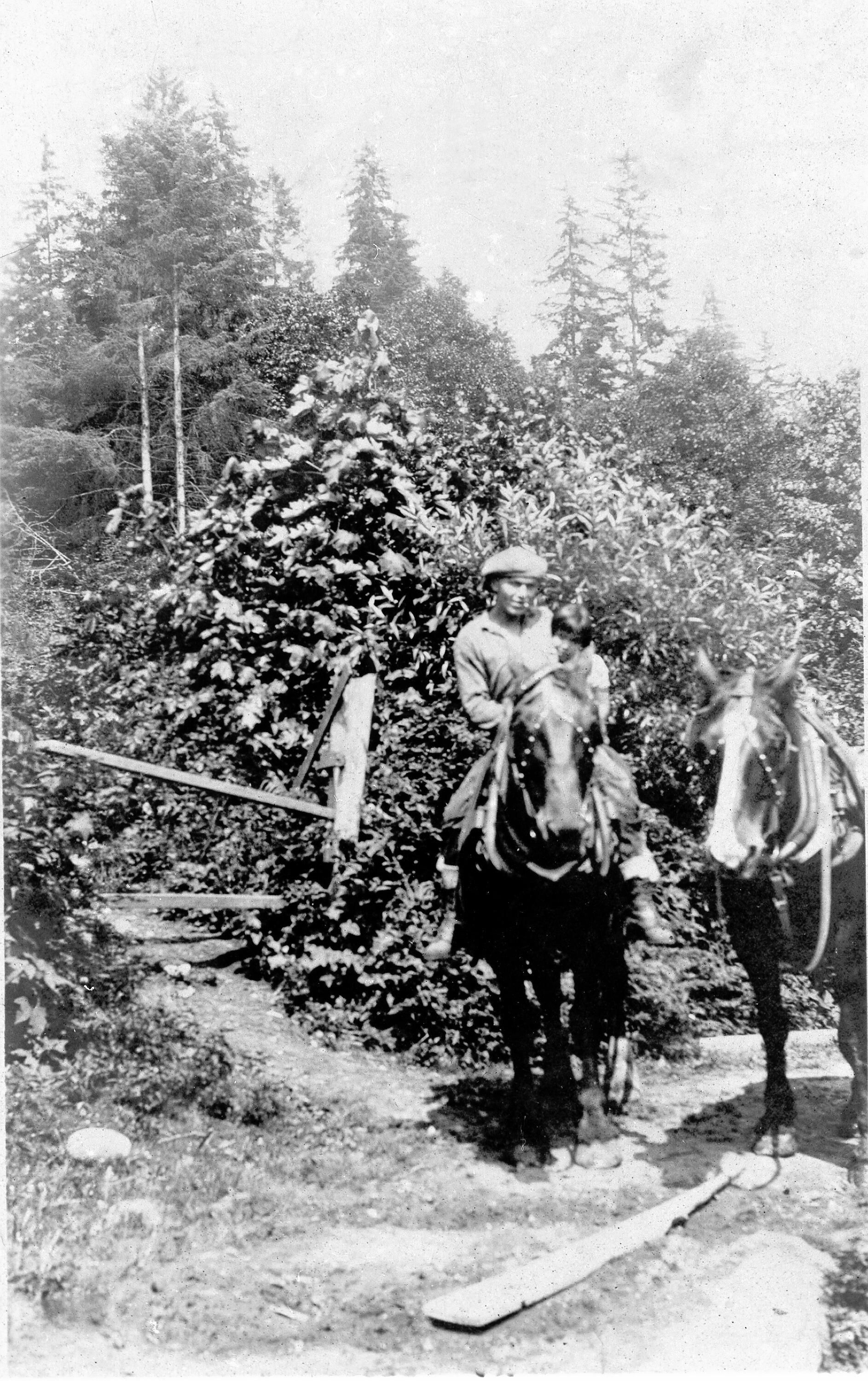 Vertical Black and white image of man, Joseph Thomas, holding grandchild, Lillian, on a horse. Another horse is to their left. Brush and trees are in the background.Collection