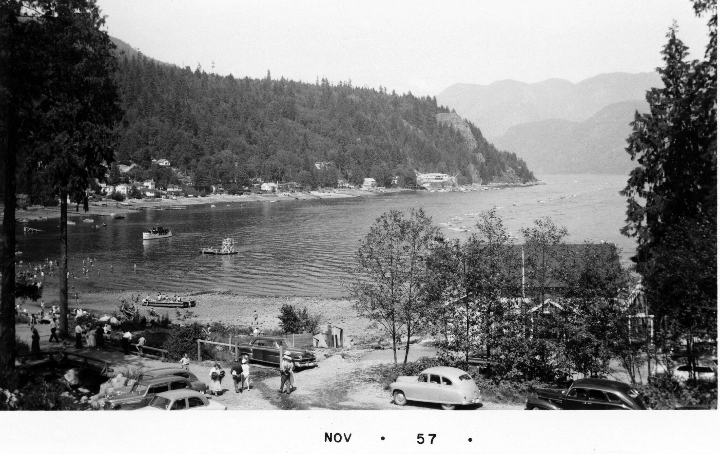 Black and white image of the cove with yacht club to the right and cars in foreground and beach with people about to left.Collection