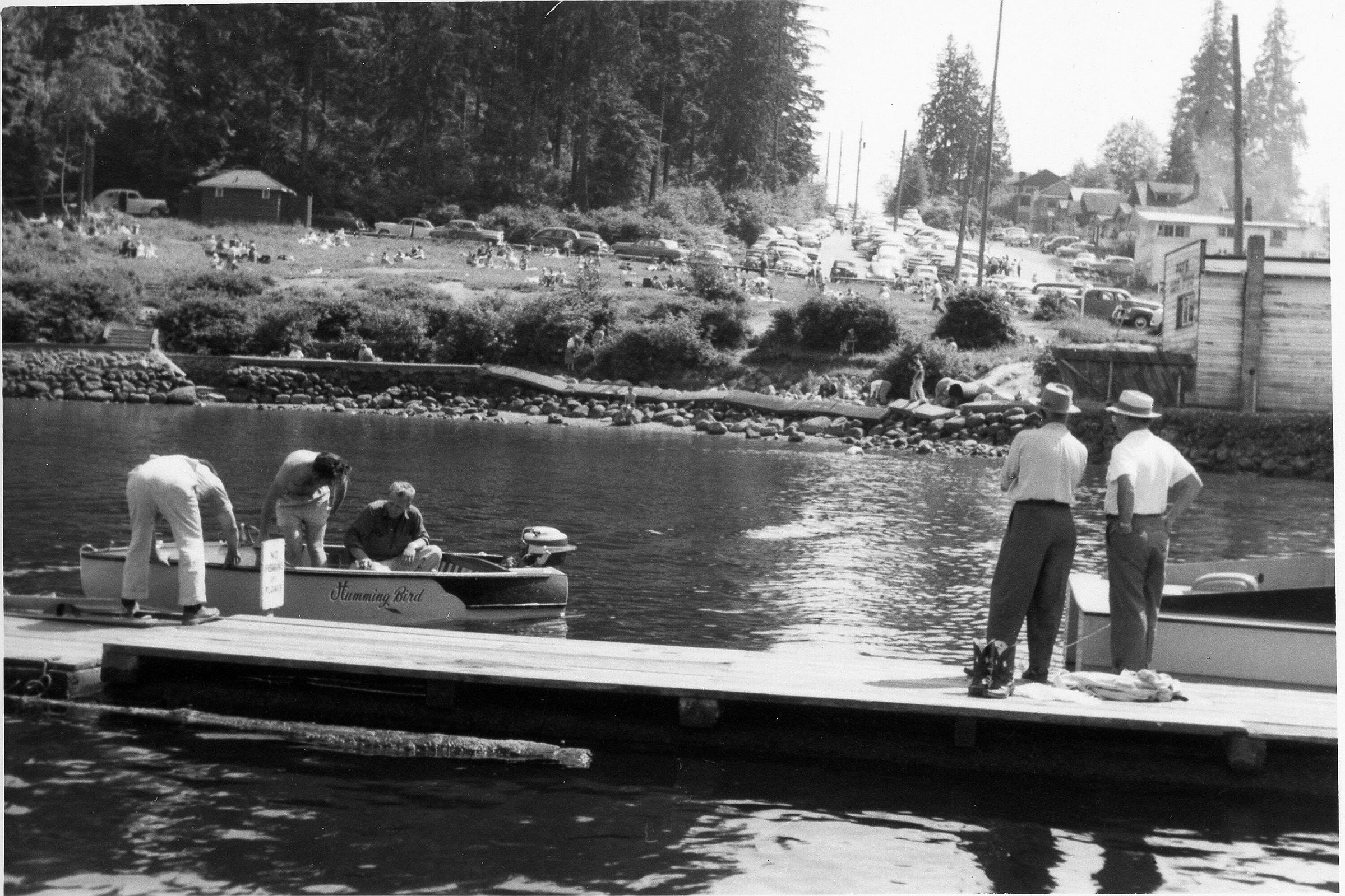 Three men in boat, and Two men to right ( perspective) standing on dock, backs turned to the