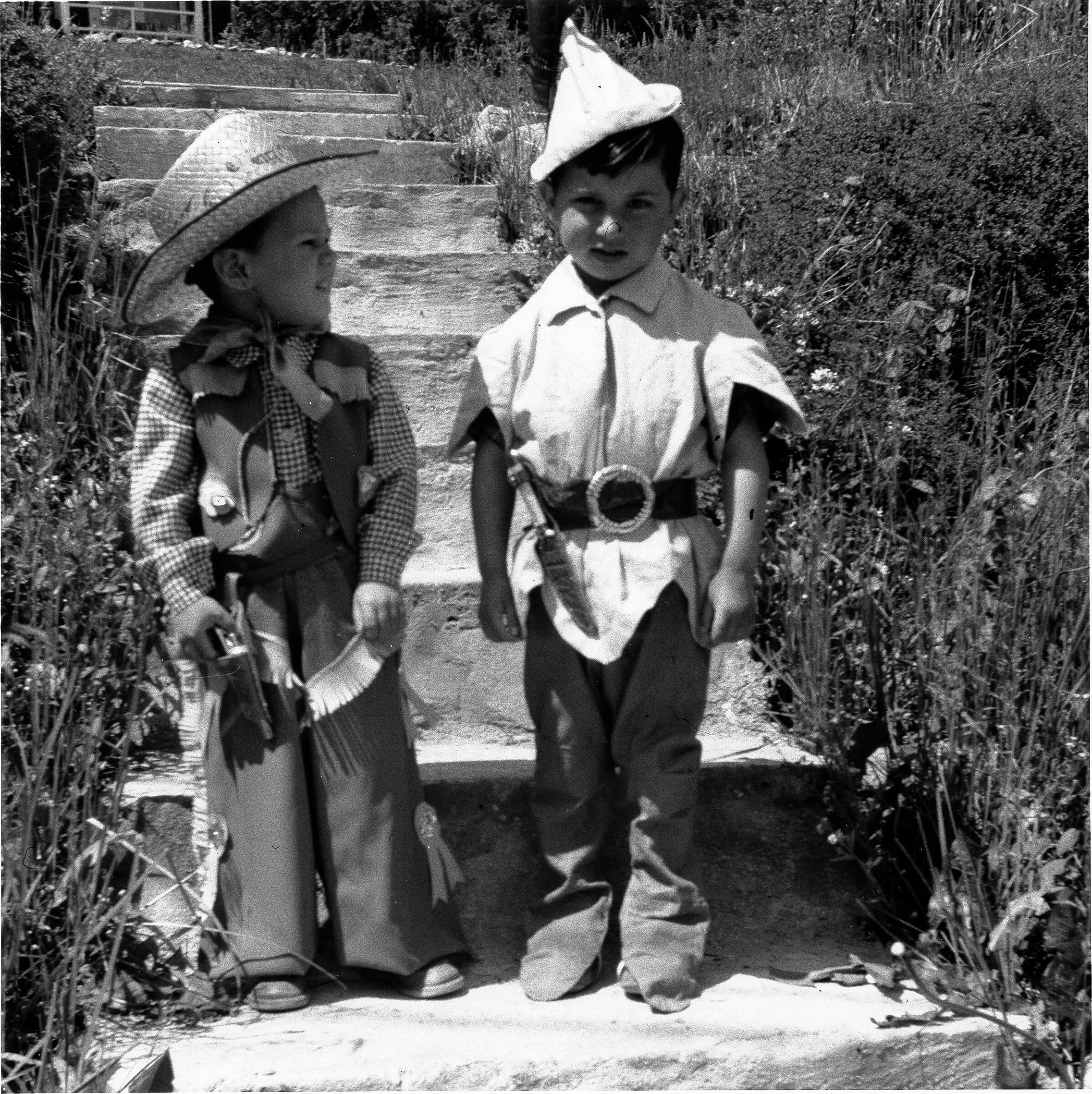 Two young boys standing on steps infront of camera. Boy on subjects left is in a cowboy costume, boy on right dressed as "Peter Pan"Collection