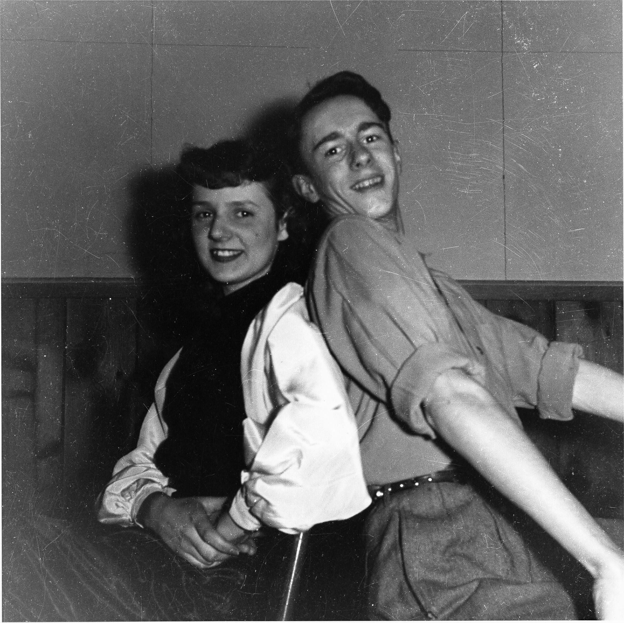 B&W Image of close up of two young people leaning back to back lookig at camera ( indoors?)Collection